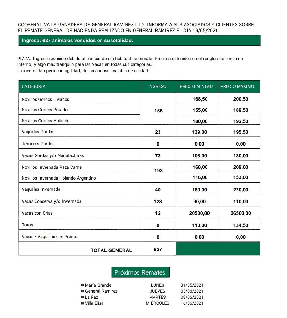 Desde Cooperativa La Ganadera de General Ramírez dieron a conocer los valores mínimos y máximos que se obtuvieron en el remate general de hacienda de este miércoles 19 en el predio ferial de General Ramírez. En total ingresaron 627 animales que fueron vendidos en su totalidad.