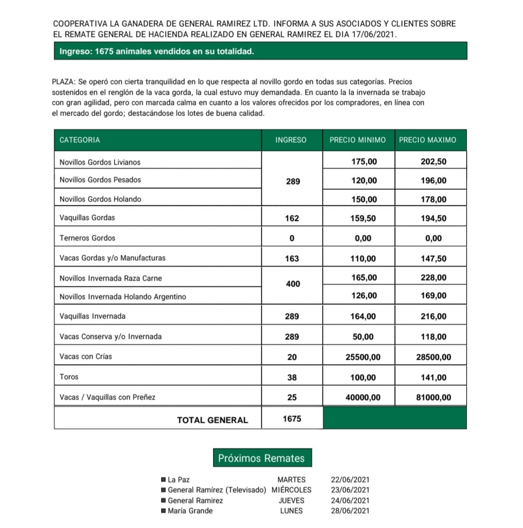 Desde Cooperativa La Ganadera de General Ramírez dieron a conocer los valores mínimos y máximos que se obtuvieron en el remate general de hacienda de este jueves 17 de junio en el predio ferial de General Ramírez. En total ingresaron 1675 animales que fueron vendidos en su totalidad.