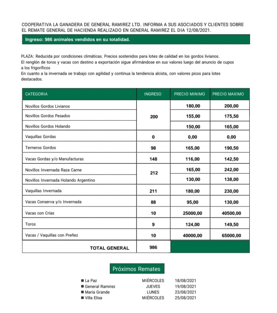 Desde Cooperativa La Ganadera de General Ramírez dieron a conocer los valores mínimos y máximos que se obtuvieron en el remate general de hacienda del jueves 12 de agosto en el predio ferial de General Ramírez. En total ingresaron 986 animales que fueron vendidos en su totalidad.