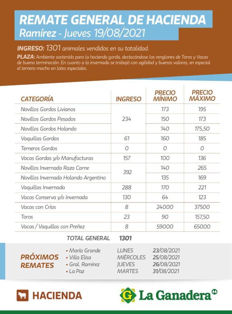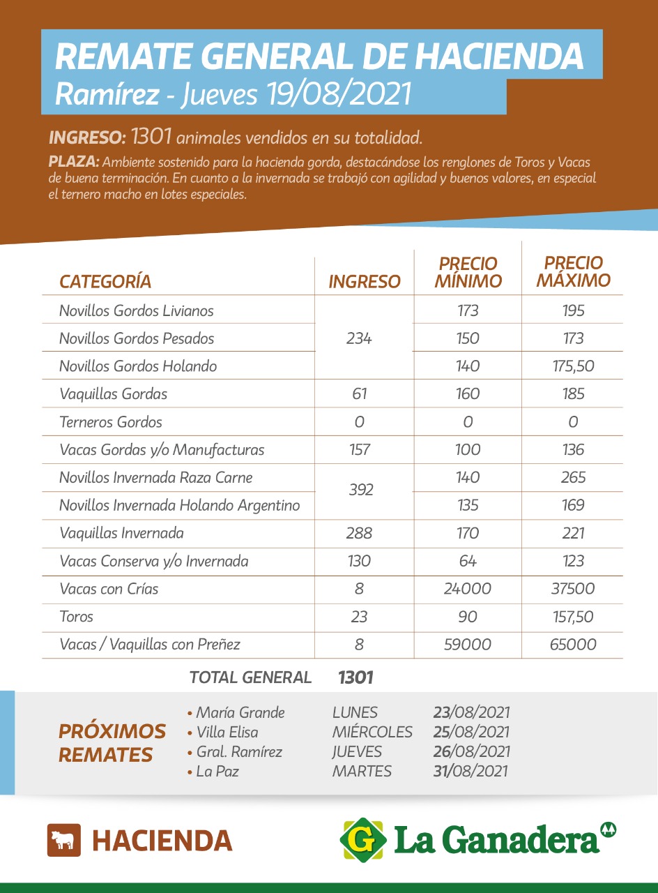Desde Cooperativa La Ganadera de General Ramírez dieron a conocer los valores mínimos y máximos que se obtuvieron en el remate general de hacienda del jueves 19 de agosto en el predio ferial de General Ramírez. En total ingresaron 1301 animales que fueron vendidos en su totalidad.