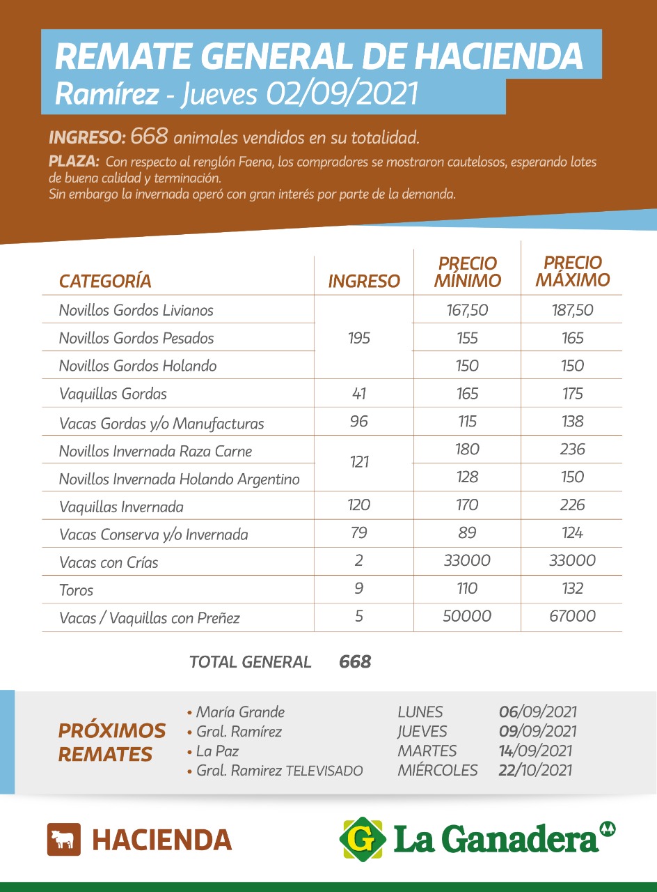 Desde Cooperativa La Ganadera de General Ramírez dieron a conocer los valores mínimos y máximos que se obtuvieron en el remate general de hacienda del jueves 2 de septiembre en el predio ferial de General Ramírez. En total ingresaron 668 animales que fueron vendidos en su totalidad.