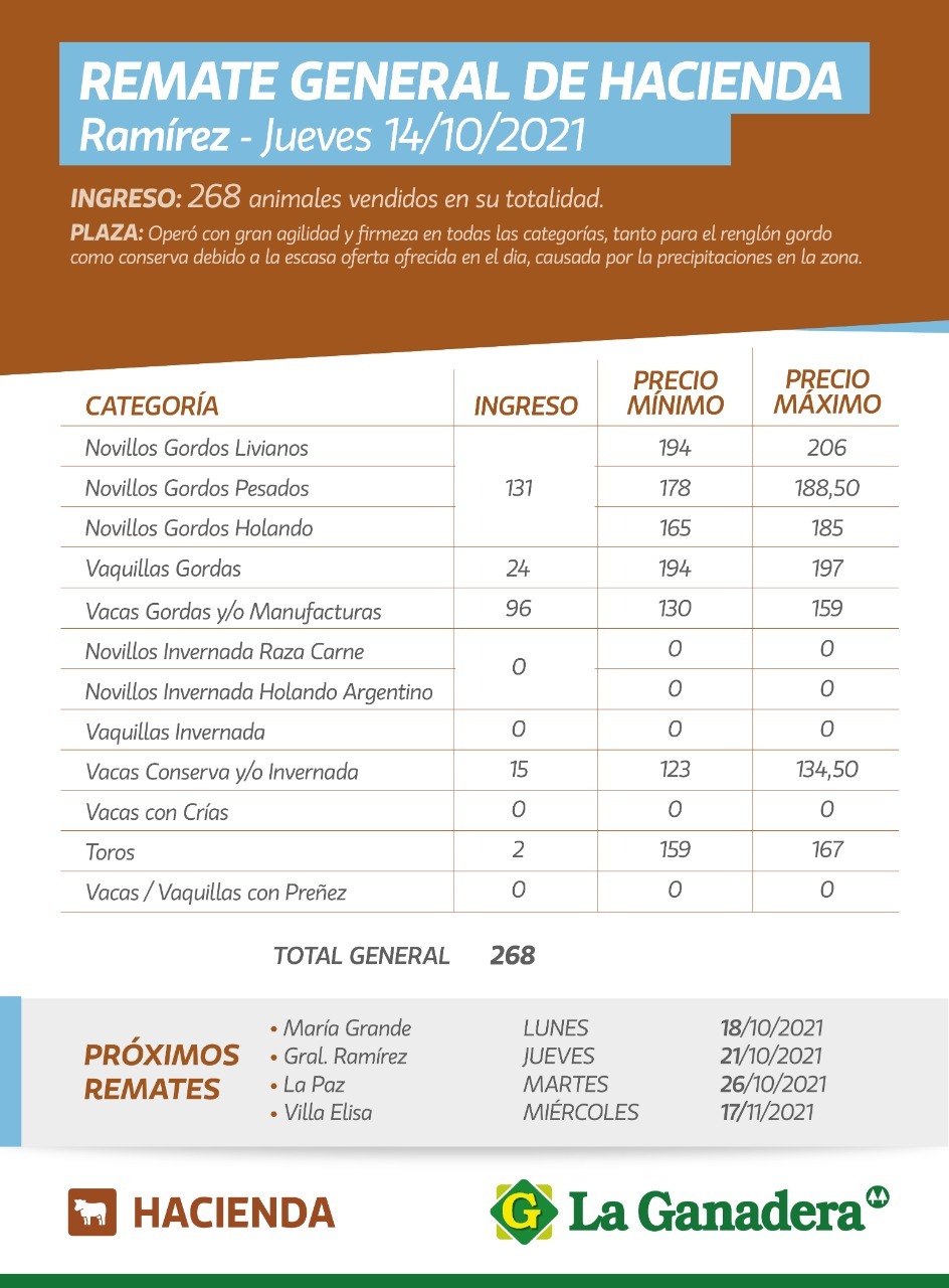 Desde Cooperativa La Ganadera de General Ramírez dieron a conocer los valores mínimos y máximos que se obtuvieron en el remate general de hacienda del jueves 14 de octubre en el predio ferial de General Ramírez. En total ingresaron 268 animales que fueron vendidos en su totalidad.