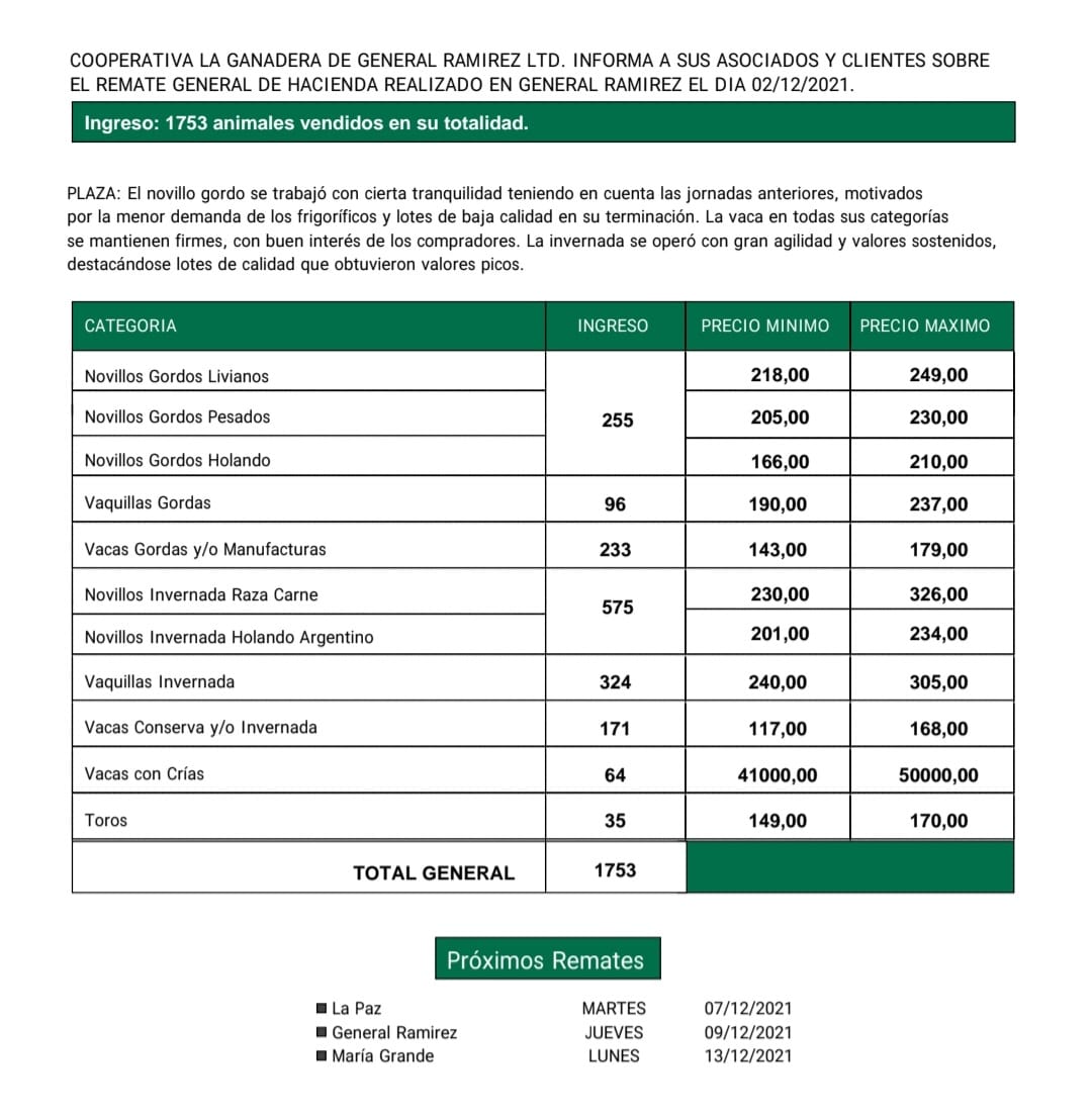 Desde Cooperativa La Ganadera de General Ramírez dieron a conocer los valores mínimos y máximos que se obtuvieron en el remate general de hacienda del jueves 02 de diciembre en el predio ferial de General Ramírez. En total ingresaron 1753 animales que fueron vendidos en su totalidad.