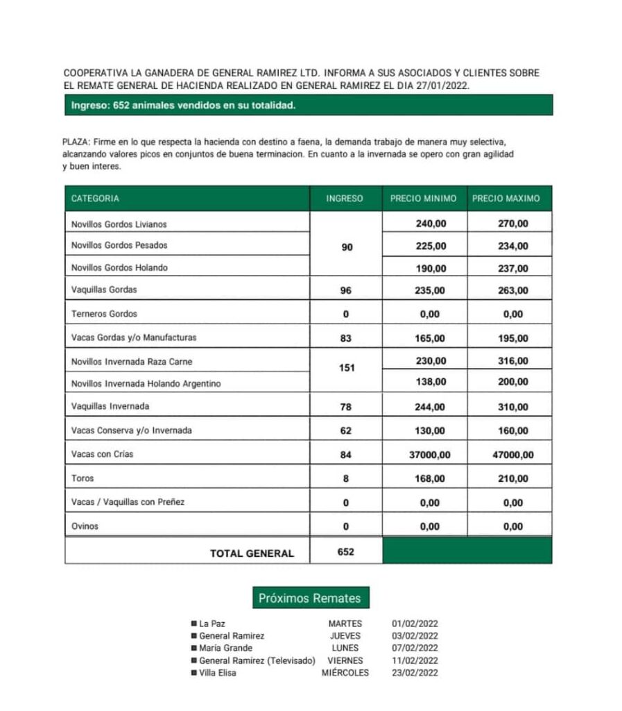 Desde Cooperativa La Ganadera de General Ramírez dieron a conocer los valores mínimos y máximos que se obtuvieron en el remate general de hacienda del jueves 27 de enero en el predio ferial de General Ramírez. En total ingresaron 652 animales que fueron vendidos en su totalidad.