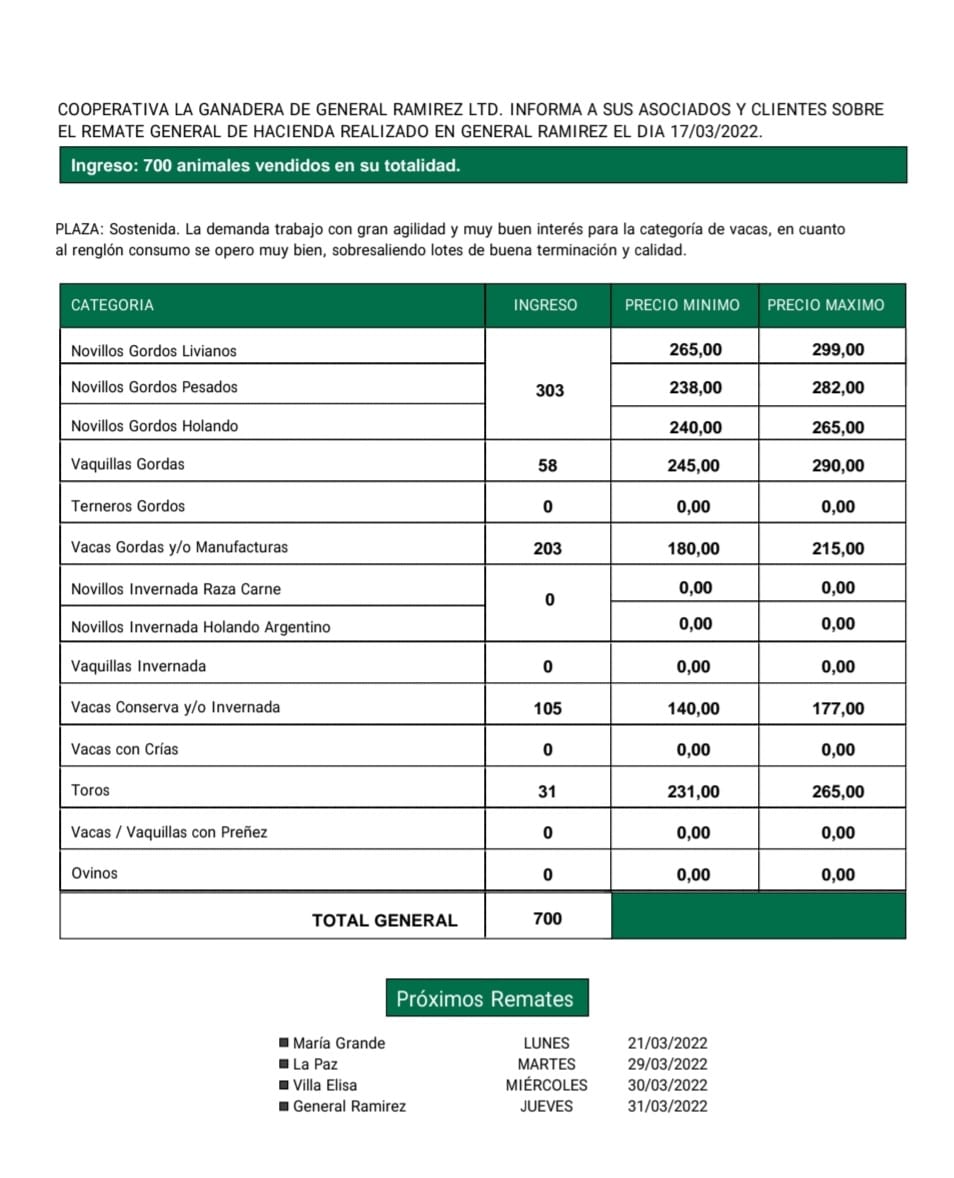 Desde Cooperativa La Ganadera de General Ramírez dieron a conocer los valores mínimos y máximos que se obtuvieron en el remate general de hacienda del jueves 17 de diciembre en el predio ferial de General Ramírez. En total ingresaron 700 animales que fueron vendidos en su totalidad.
