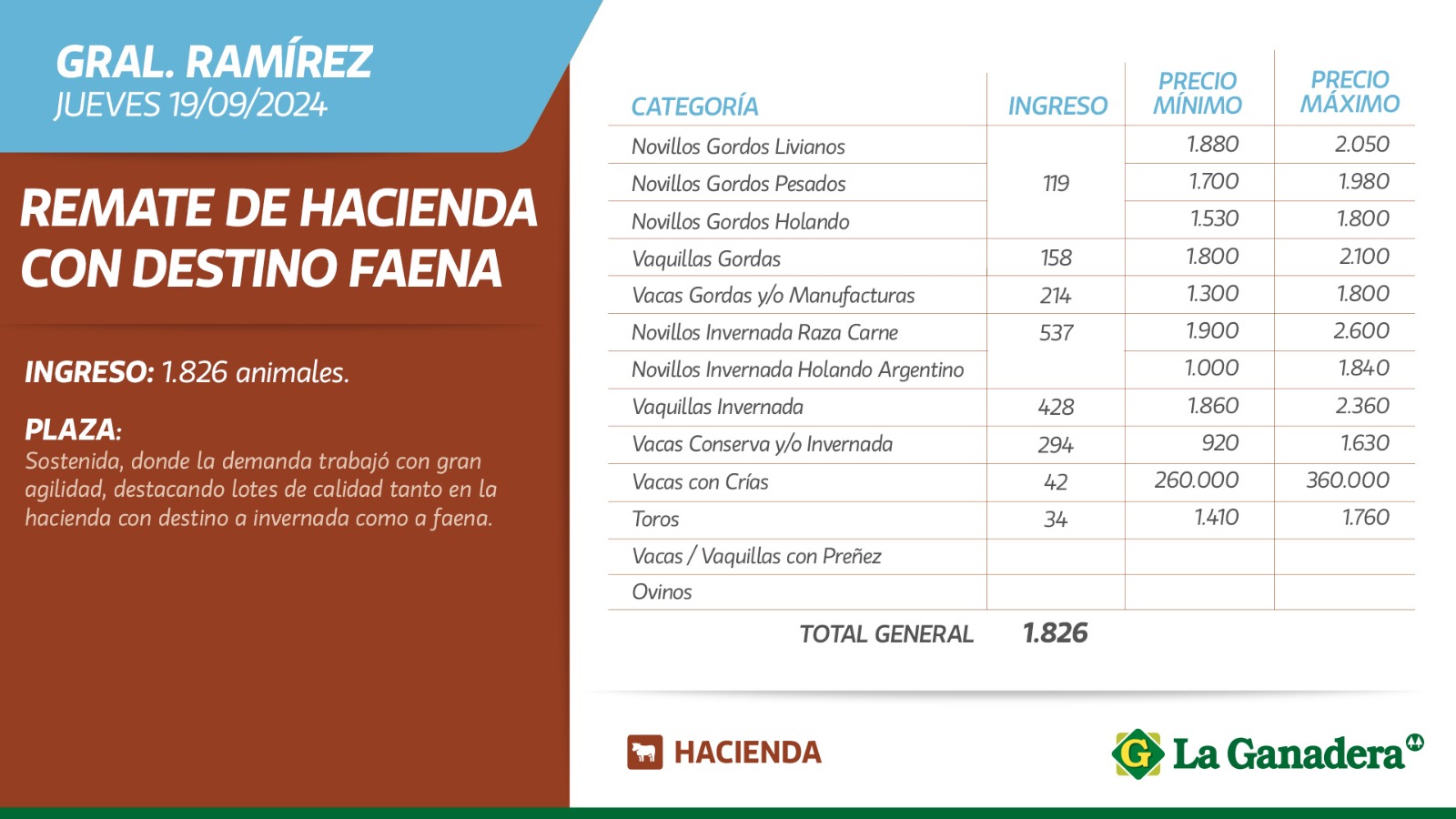 Desde Cooperativa La Ganadera de General Ramírez dieron a conocer los valores mínimos y máximos que se obtuvieron en el remate general de hacienda del jueves 19 de septiembre de 2024 en el predio ferial de General Ramírez. En total ingresaron 1.826 animales.