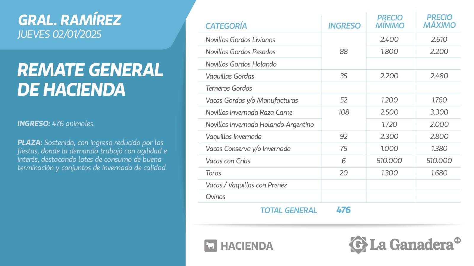 Desde Cooperativa La Ganadera de General Ramírez dieron a conocer los valores mínimos y máximos que se obtuvieron en el remate general de hacienda del jueves 2 de diciembre en el predio ferial de General Ramírez. En total ingresaron 476 animales.