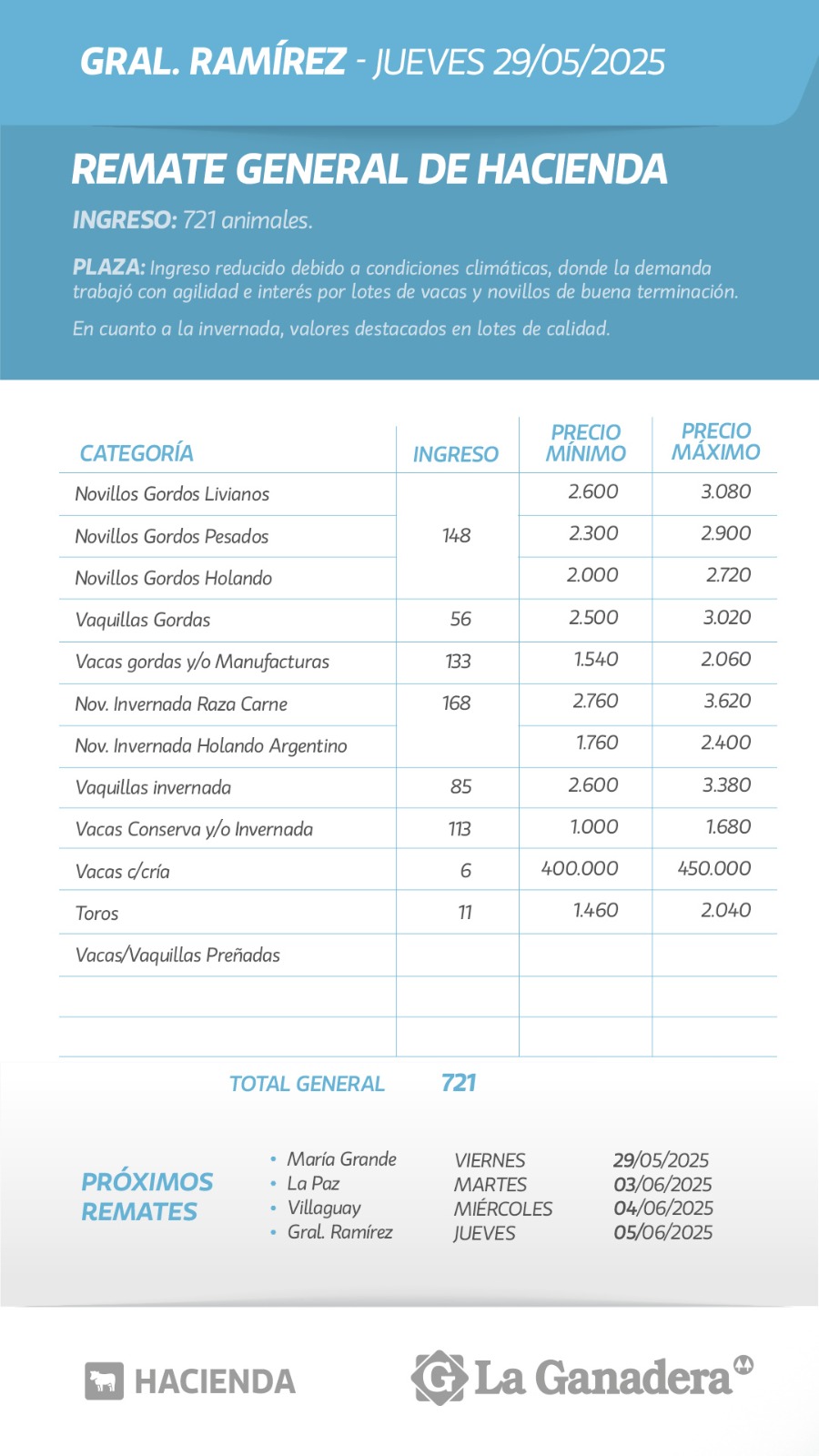 Desde Cooperativa La Ganadera de General Ramírez dieron a conocer los valores mínimos y máximos que se obtuvieron en el remate general de hacienda del jueves 29 de mayo en el predio ferial de General Ramírez. En total ingresaron 721 animales.