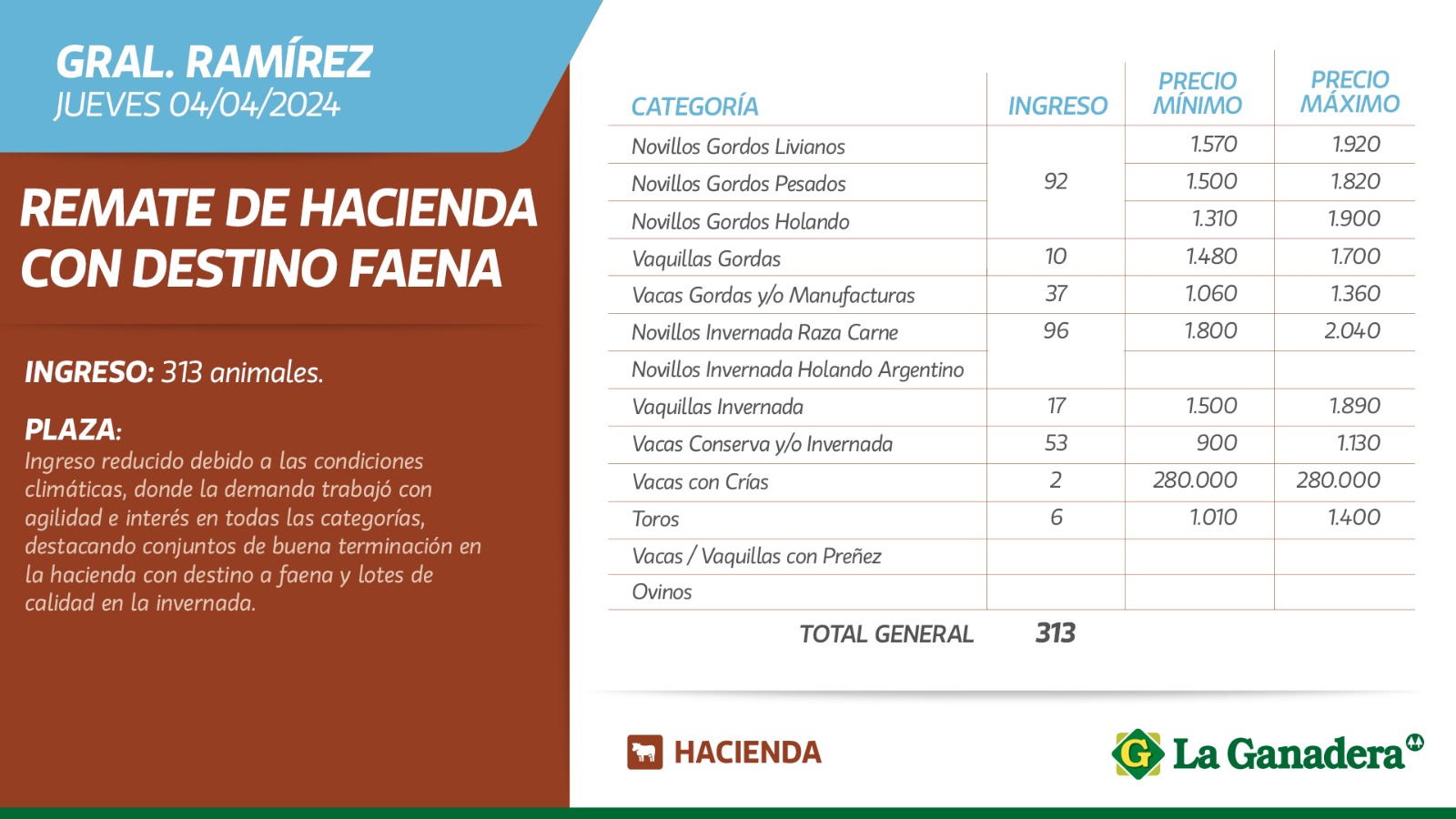 Desde Cooperativa La Ganadera de General Ramírez dieron a conocer los valores mínimos y máximos que se obtuvieron en el remate general de hacienda del jueves 4 de abril 2024 en el predio ferial de General Ramírez. En total ingresaron 313 animales.