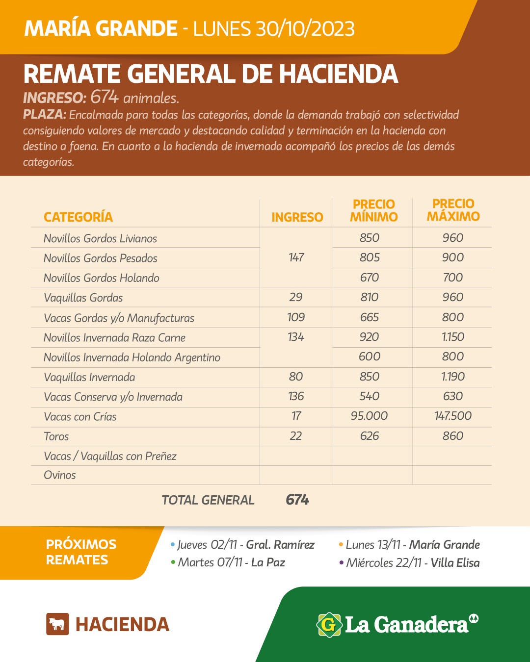 Desde Cooperativa La Ganadera de General Ramírez dieron a conocer los valores mínimos y máximos que se obtuvieron en el remate general de hacienda del lunes 30 de octubre de 2023 en el predio ferial de General Ramírez. En total ingresaron 674 animales.