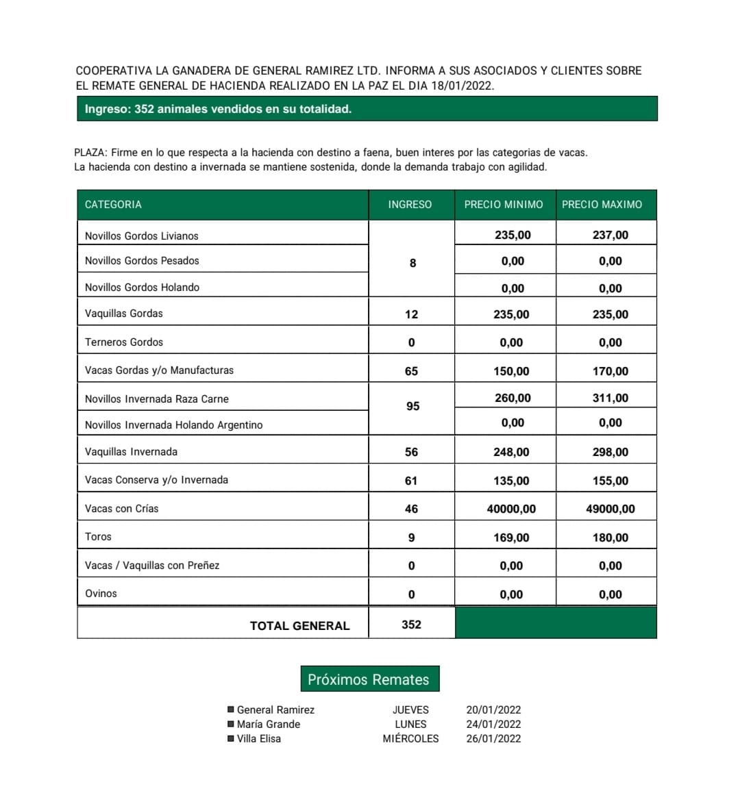 Desde Cooperativa La Ganadera de General Ramírez dieron a conocer los valores mínimos y máximos que se obtuvieron en el remate general de hacienda que realizaron este martes 18 de enero en La Paz. En total ingresaron 352 animales que fueron vendidos en su totalidad.