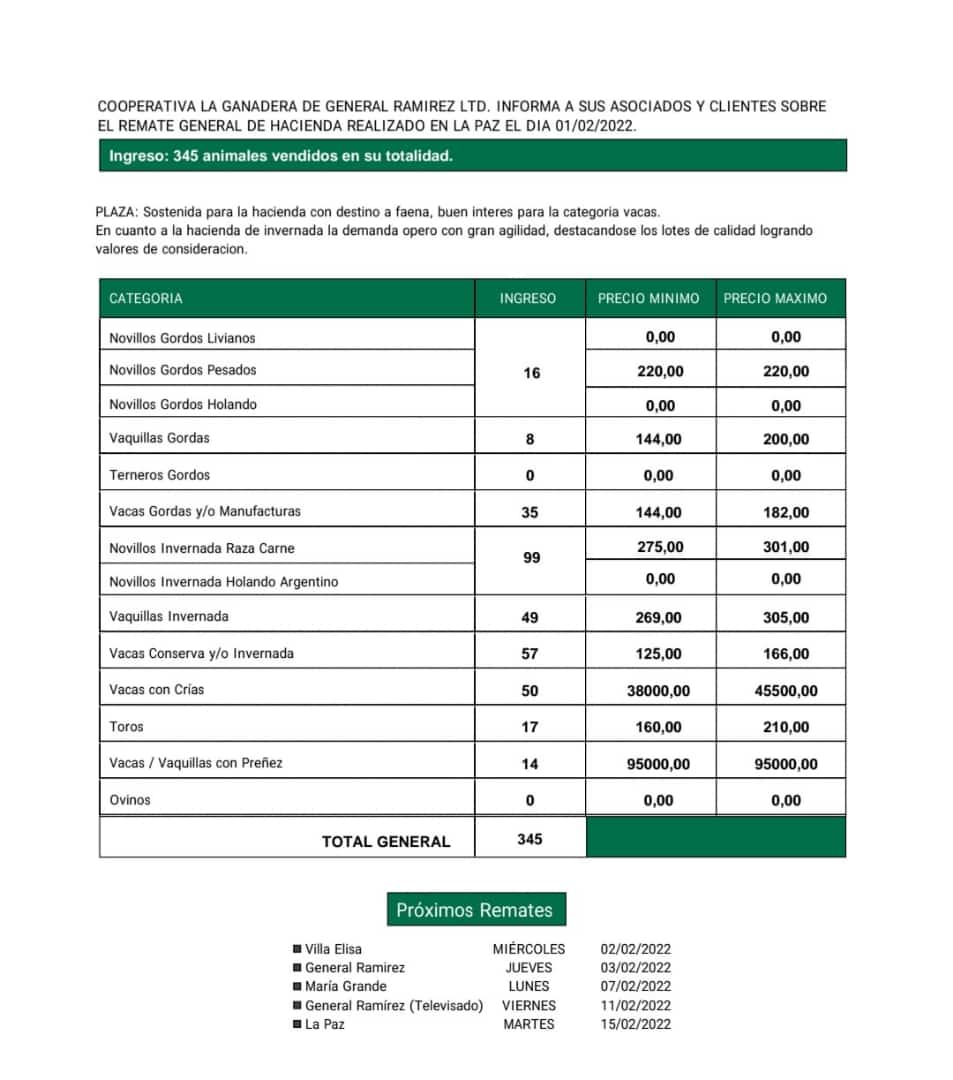 Desde Cooperativa La Ganadera de General Ramírez dieron a conocer los valores mínimos y máximos que se obtuvieron en el remate general de hacienda que realizaron este martes 01 de febrero en La Paz. En total ingresaron 345 animales que fueron vendidos en su totalidad.