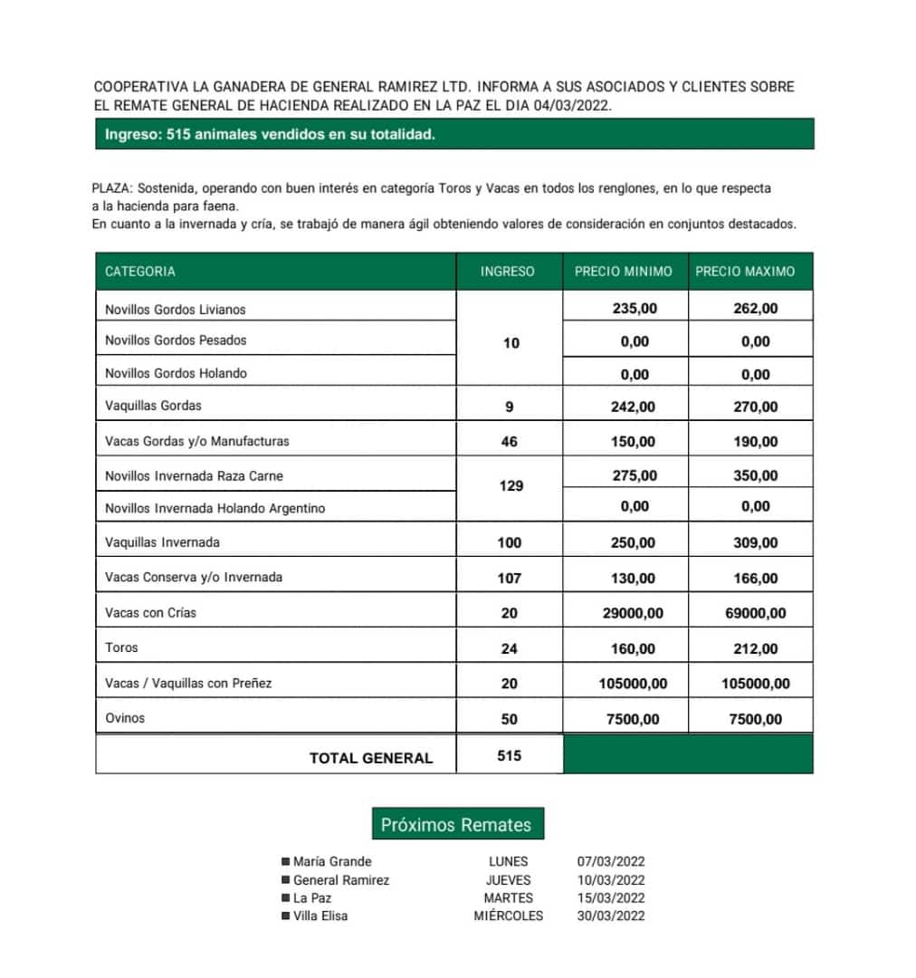 Desde Cooperativa La Ganadera de General Ramírez dieron a conocer los valores mínimos y máximos que se obtuvieron en el remate general de hacienda del viernes 4 de marzo en La Paz. En total ingresaron 515 animales que fueron vendidos en su totalidad.