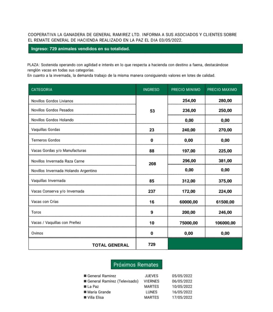 Desde Cooperativa La Ganadera de General Ramírez dieron a conocer los valores mínimos y máximos que se obtuvieron en el remate general de hacienda del martes 03 de mayo en el predio ferial de La Paz. En total ingresaron 729 animales que fueron vendidos en su totalidad.