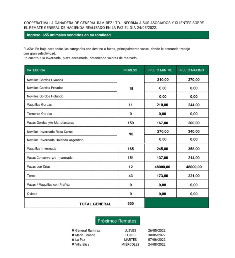 Desde Cooperativa La Ganadera de General Ramírez dieron a conocer los valores mínimos y máximos que se obtuvieron en el remate general de hacienda del martes 24 de mayo en el predio ferial de La Paz. En total ingresaron 655 animales que fueron vendidos en su totalidad.