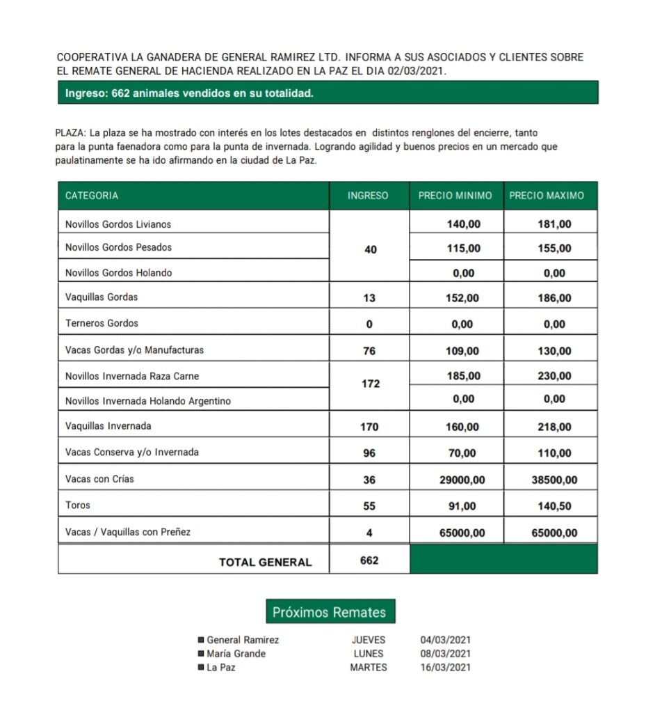 Desde Cooperativa La Ganadera de General Ramírez dieron a conocer los valores mínimos y máximos que se obtuvieron en el remate general de hacienda que realizaron este martes 2 de febrero en La Paz. En total ingresaron 662 animales que fueron vendidos en su totalidad.
