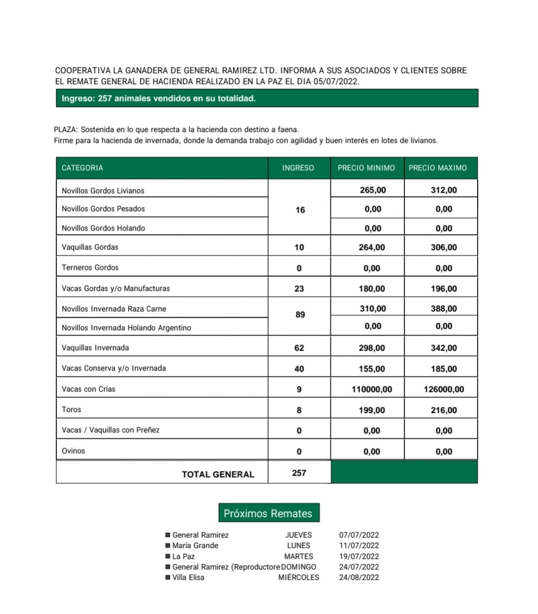 Desde Cooperativa La Ganadera de General Ramírez dieron a conocer los valores mínimos y máximos que se obtuvieron en el remate general de hacienda del martes 05 de julio en el predio ferial de La Paz. En total ingresaron 257 animales que fueron vendidos en su totalidad.