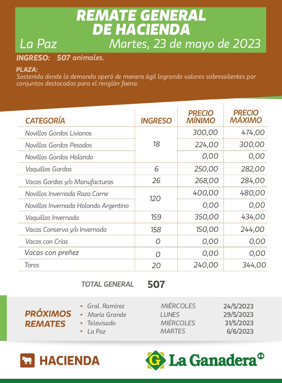 Desde Cooperativa La Ganadera de General Ramírez dieron a conocer los valores mínimos y máximos que se obtuvieron en el remate general de hacienda del martes 23 de mayo en el predio ferial de La Paz. En total ingresaron 507 animales que fueron vendidos en su totalidad.