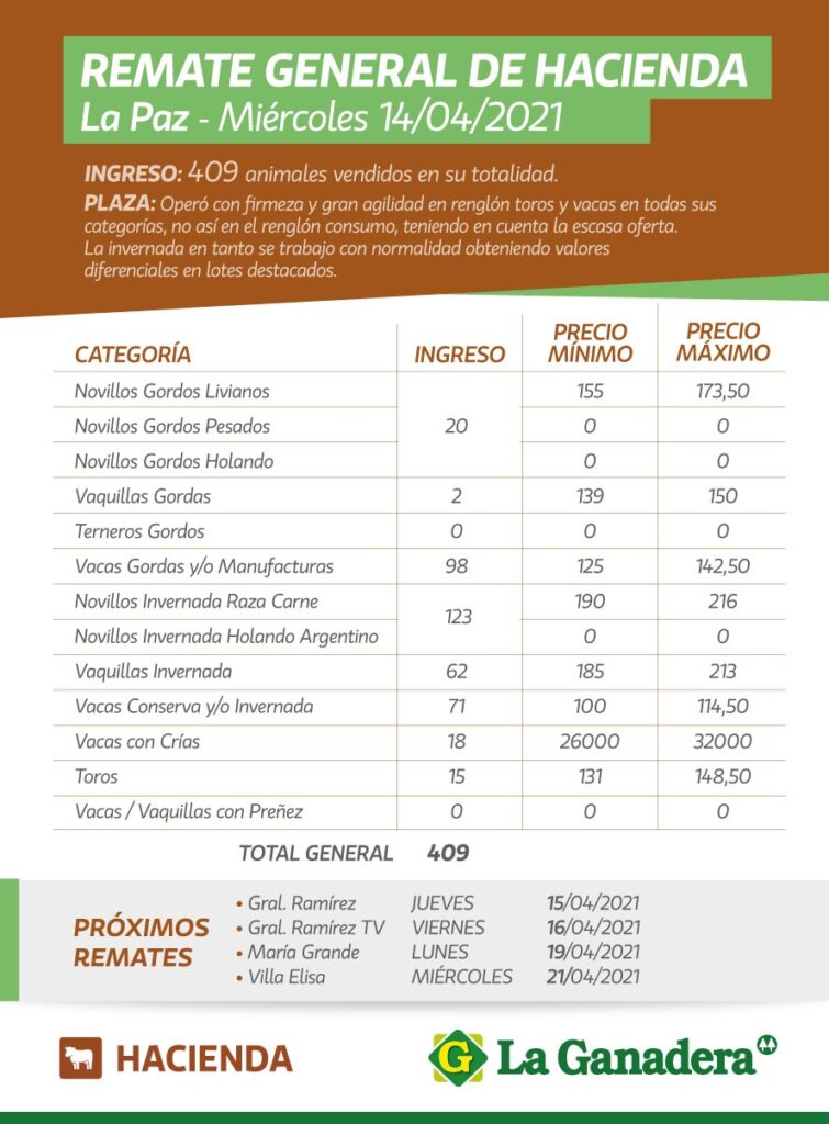 Desde Cooperativa La Ganadera de General Ramírez dieron a conocer los valores mínimos y máximos que se obtuvieron en el remate general de hacienda que realizaron este miércoles 14 de abril en La Paz. En total ingresaron 409 animales que fueron vendidos en su totalidad.