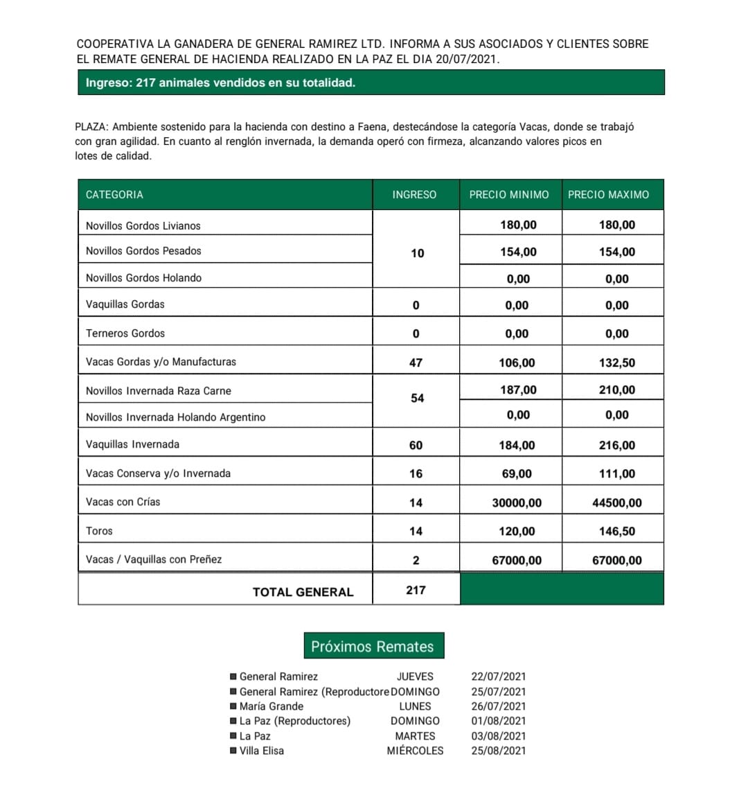 Desde Cooperativa La Ganadera de General Ramírez dieron a conocer los valores mínimos y máximos que se obtuvieron en el remate general de hacienda de este martes 20 de julio en el predio ferial de La Paz. En total ingresaron 217 animales que fueron vendidos en su totalidad.