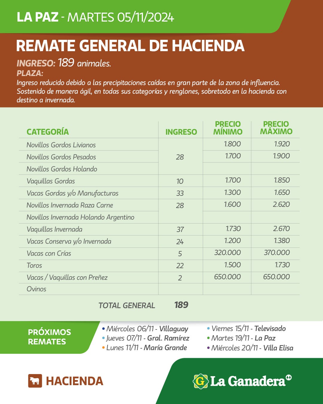 Desde Cooperativa La Ganadera de General Ramírez dieron a conocer los valores mínimos y máximos que se obtuvieron en el remate general de hacienda del martes 05 de noviembre de 2024 en el predio ferial de La Paz. En total ingresaron 189 animales.