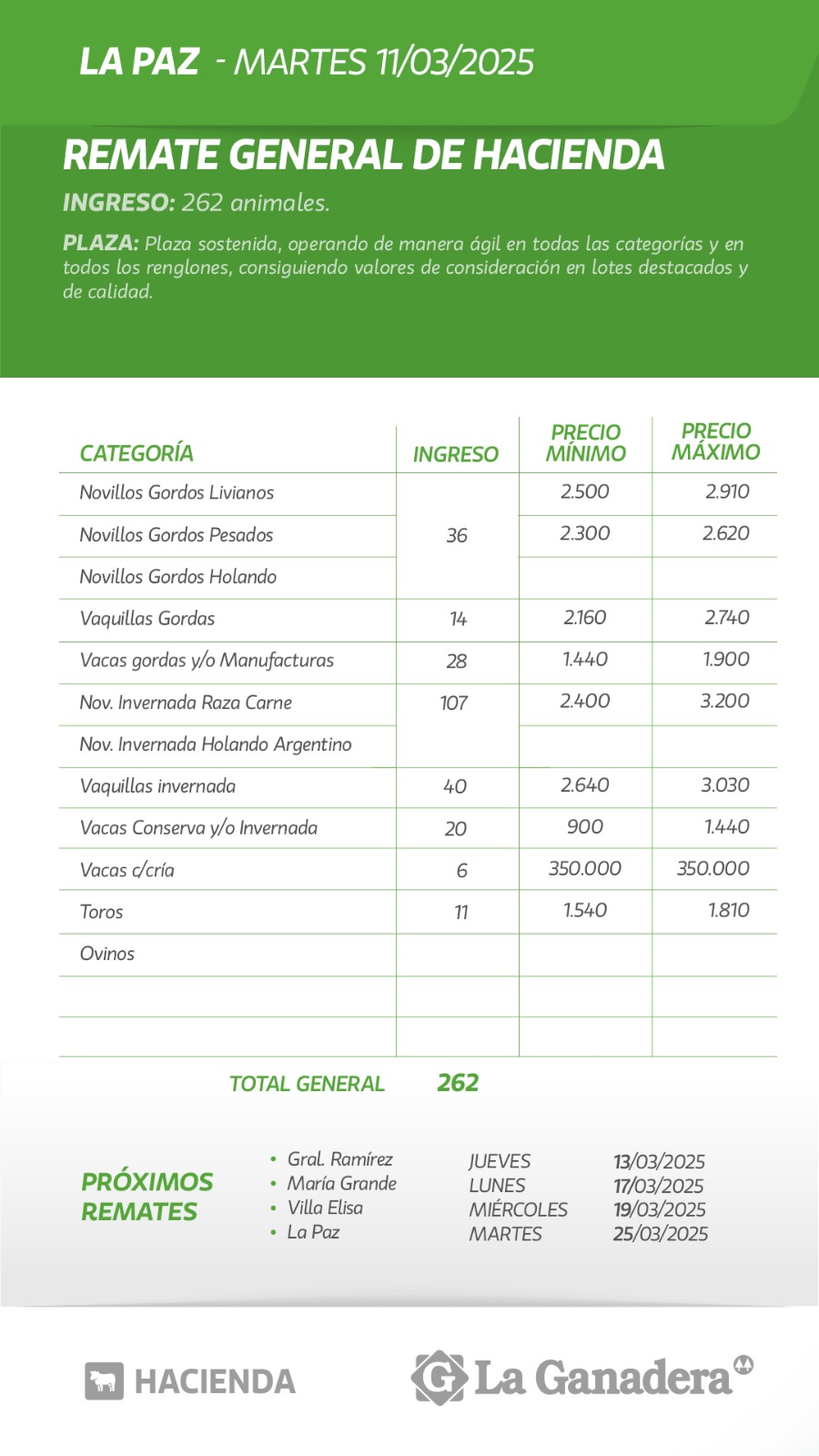 Desde Cooperativa La Ganadera de General Ramírez dieron a conocer los valores mínimos y máximos que se obtuvieron en el remate general de hacienda del martes 11 de marzo de 2025 en el predio ferial de La Paz. En total ingresaron 262 animales.
