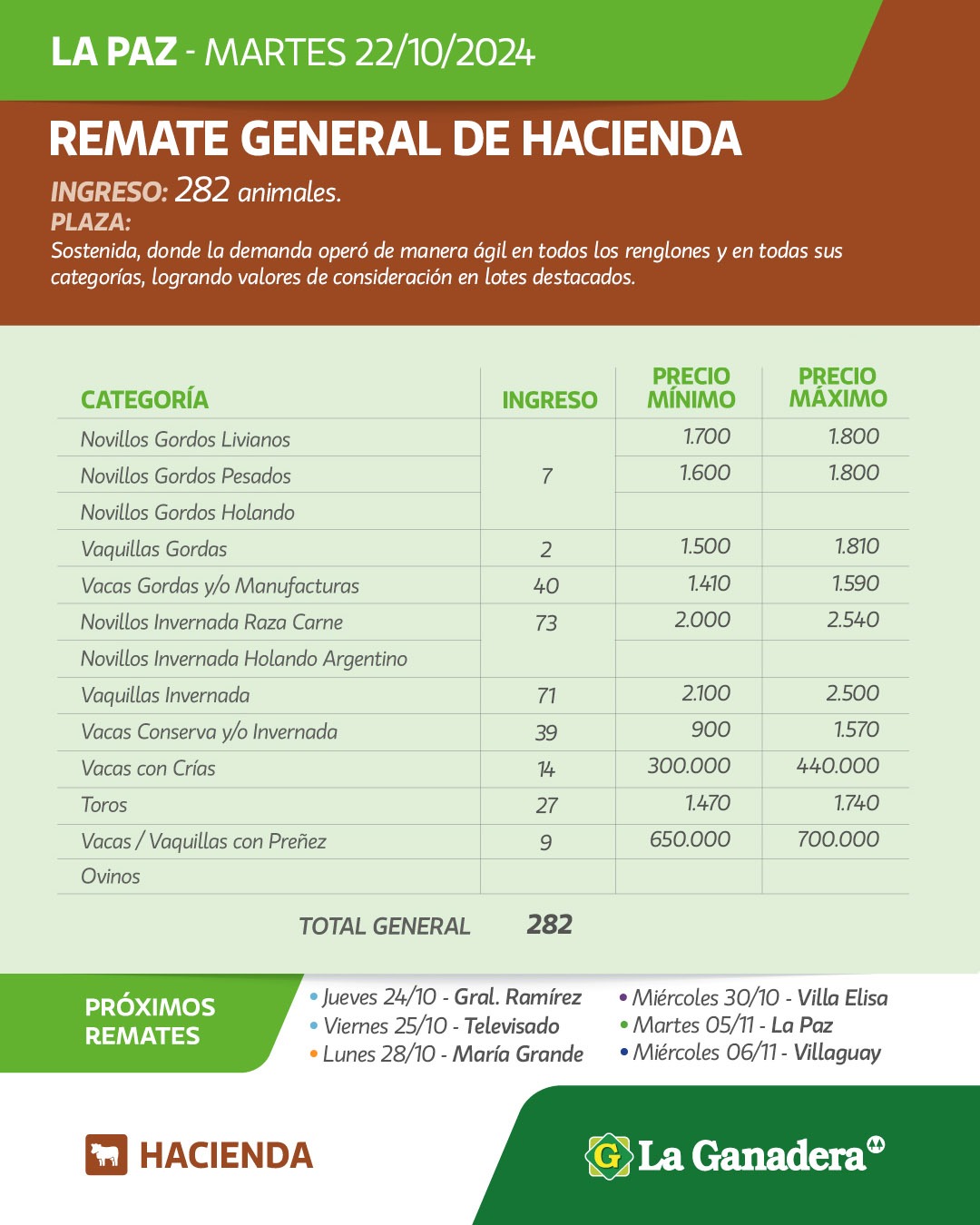 Desde Cooperativa La Ganadera de General Ramírez dieron a conocer los valores mínimos y máximos que se obtuvieron en el remate general de hacienda del martes 22 de octubre de 2024 en el predio ferial de La Paz. En total ingresaron 282 animales.