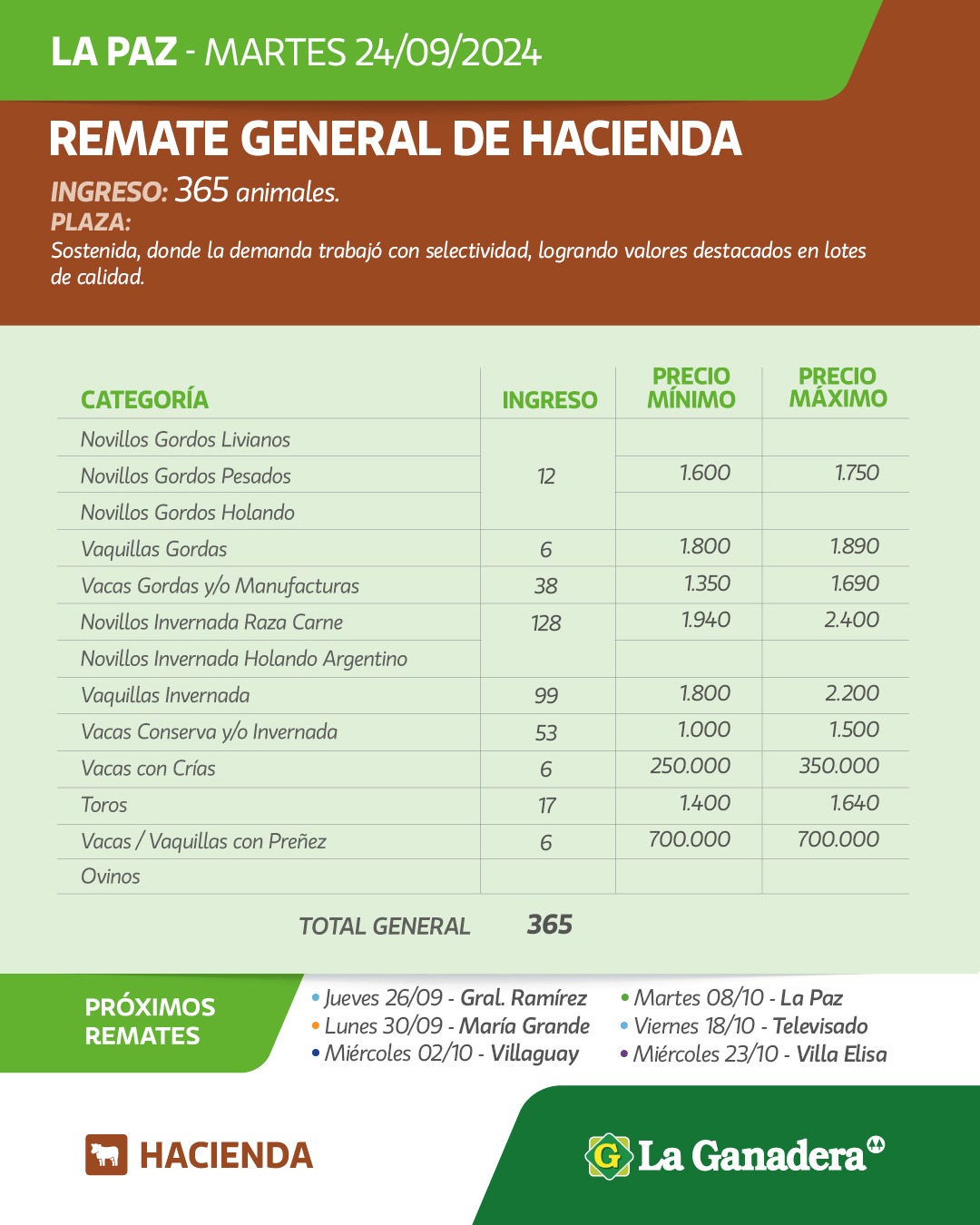 Desde Cooperativa La Ganadera de General Ramírez dieron a conocer los valores mínimos y máximos que se obtuvieron en el remate general de hacienda del martes 24 de septiembre de 2024 en el predio ferial de La Paz. En total ingresaron 365 animales.