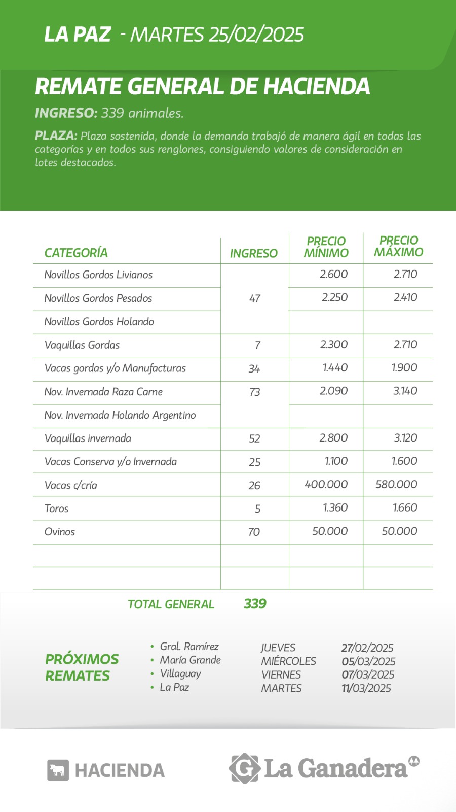 Desde Cooperativa La Ganadera de General Ramírez dieron a conocer los valores mínimos y máximos que se obtuvieron en el remate general de hacienda del martes 25 de febrero de 2025 en el predio ferial de La Paz. En total ingresaron 339 animales.