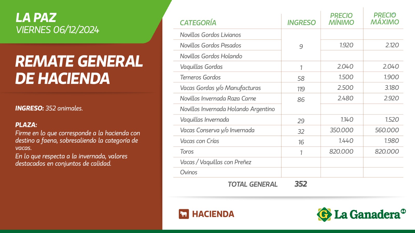 Desde Cooperativa La Ganadera de General Ramírez dieron a conocer los valores mínimos y máximos que se obtuvieron en el remate general de hacienda del viernes 06 de diciembre de 2024 en el predio ferial de La Paz. En total ingresaron 352 animales.
