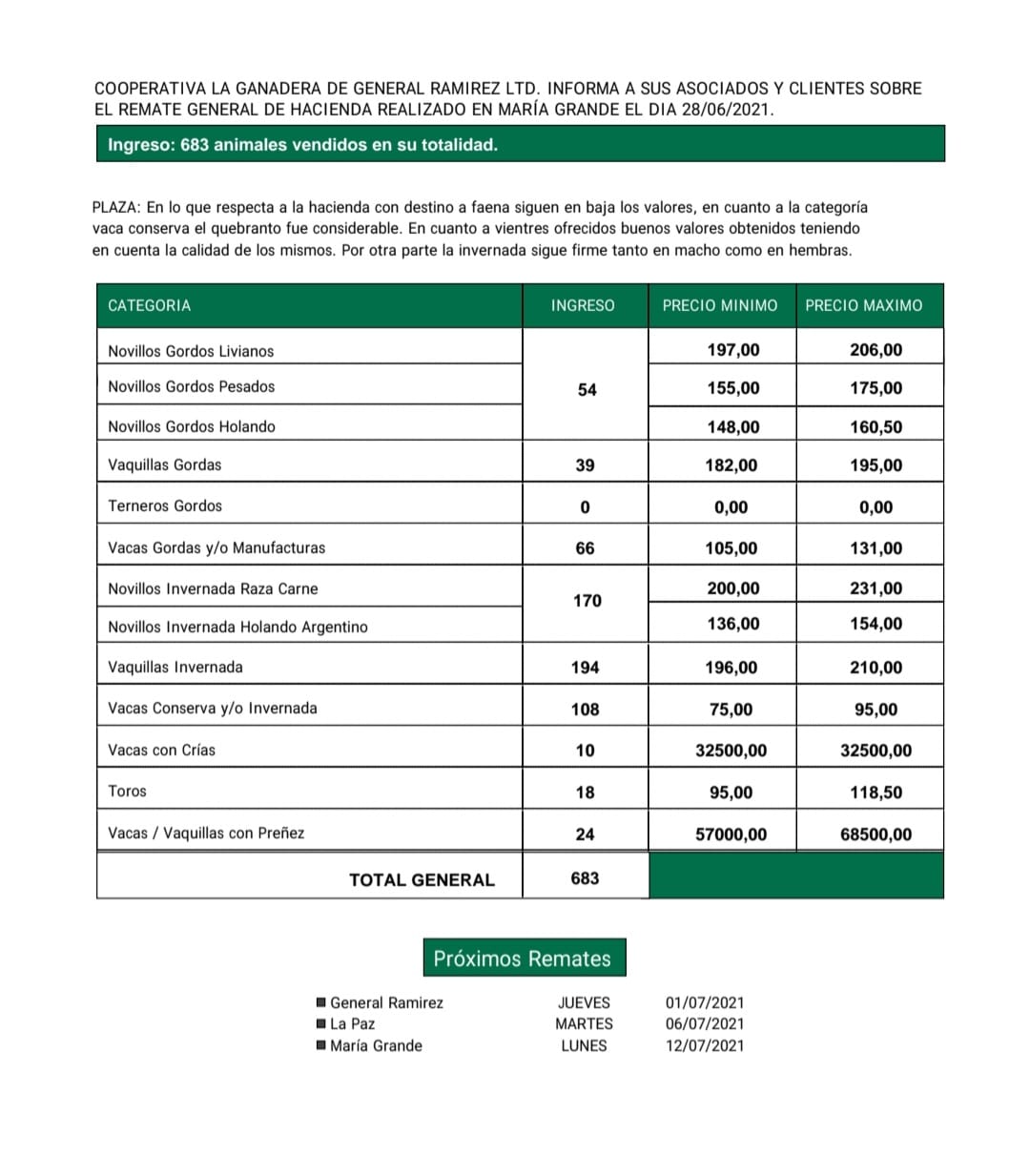 Desde Cooperativa La Ganadera de General Ramírez dieron a conocer los valores mínimos y máximos que se obtuvieron en el remate general de hacienda de este lunes 28 de junio de en María Grande. En total ingresaron 683 animales que fueron vendidos en su totalidad.