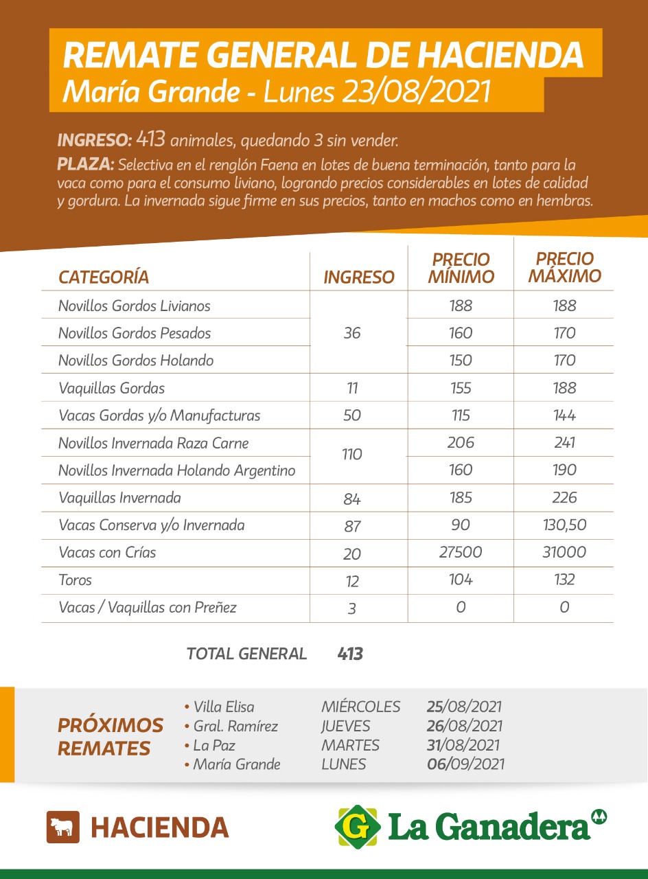 Desde Cooperativa La Ganadera de General Ramírez dieron a conocer los valores mínimos y máximos que se obtuvieron en el remate general de hacienda realizaron el lunes 23 de agosto en María Grande. En total ingresaron 413 animales y quedaron tres sin vender.