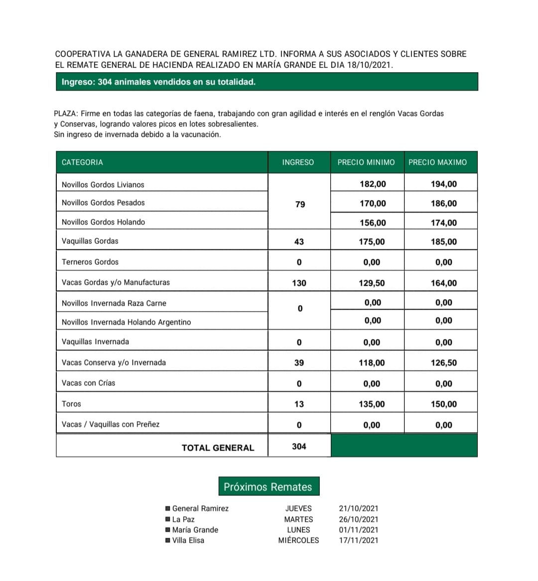 Desde Cooperativa La Ganadera de General Ramírez dieron a conocer los valores mínimos y máximos que se obtuvieron en el remate general de hacienda que realizaron este lunes 18 de octubre en María Grande. En total ingresaron 304 animales que fueron vendidos en su totalidad.