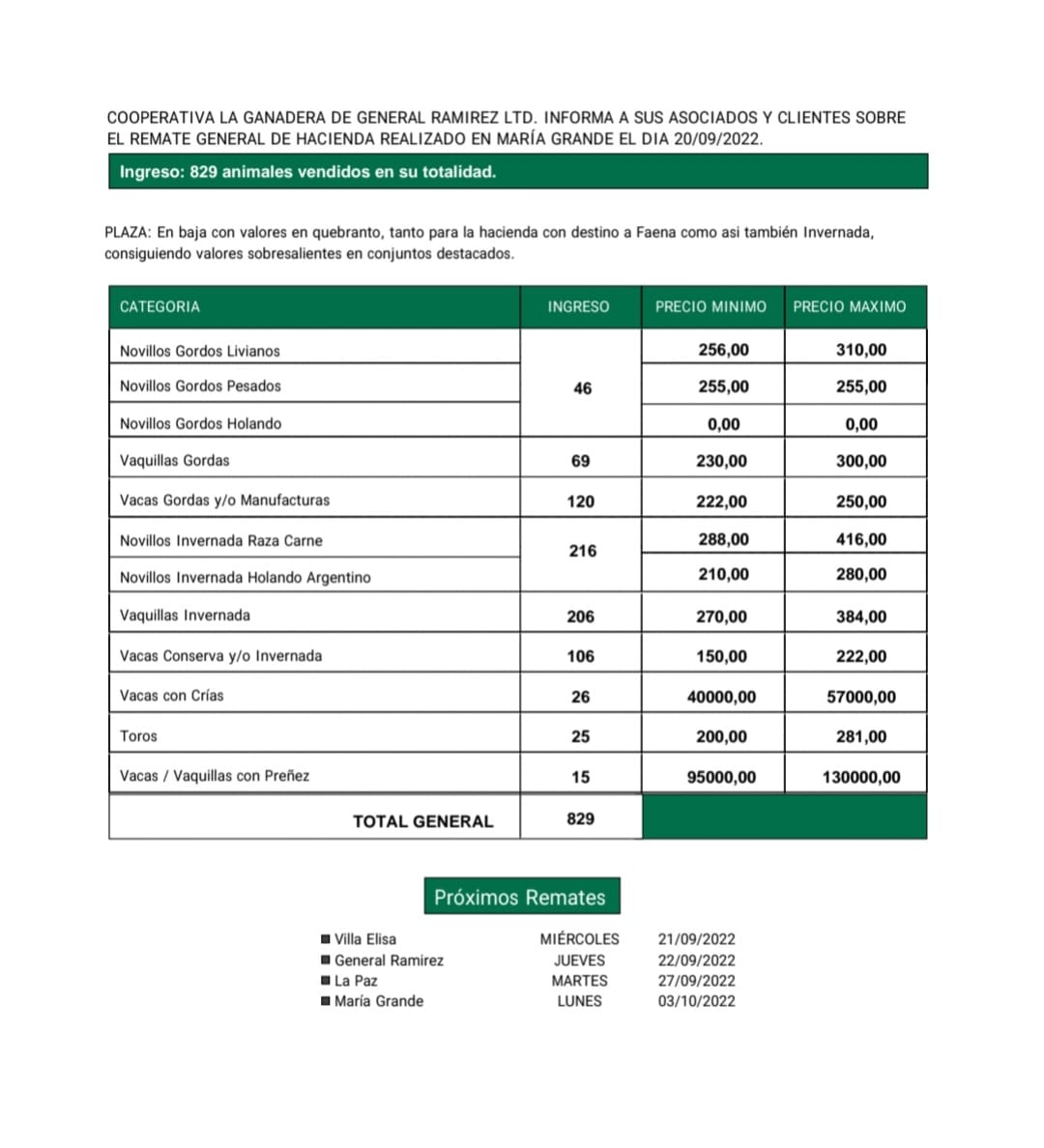 Desde Cooperativa La Ganadera de General Ramírez dieron a conocer los valores mínimos y máximos que se obtuvieron en el remate general de hacienda que realizaron este lunes 20 de septiembre en María Grande. En total ingresaron 829 animales que fueron vendidos en su totalidad.