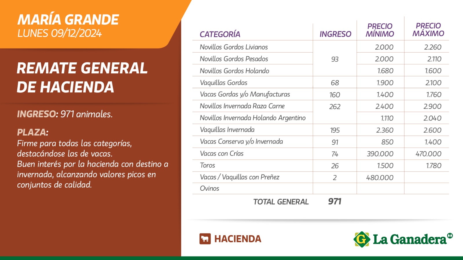 Desde Cooperativa La Ganadera de General Ramírez dieron a conocer los valores mínimos y máximos que se obtuvieron en el remate general de hacienda que realizaron este lunes 09 de diciembre en María Grande. En total ingresaron 971 animales.
