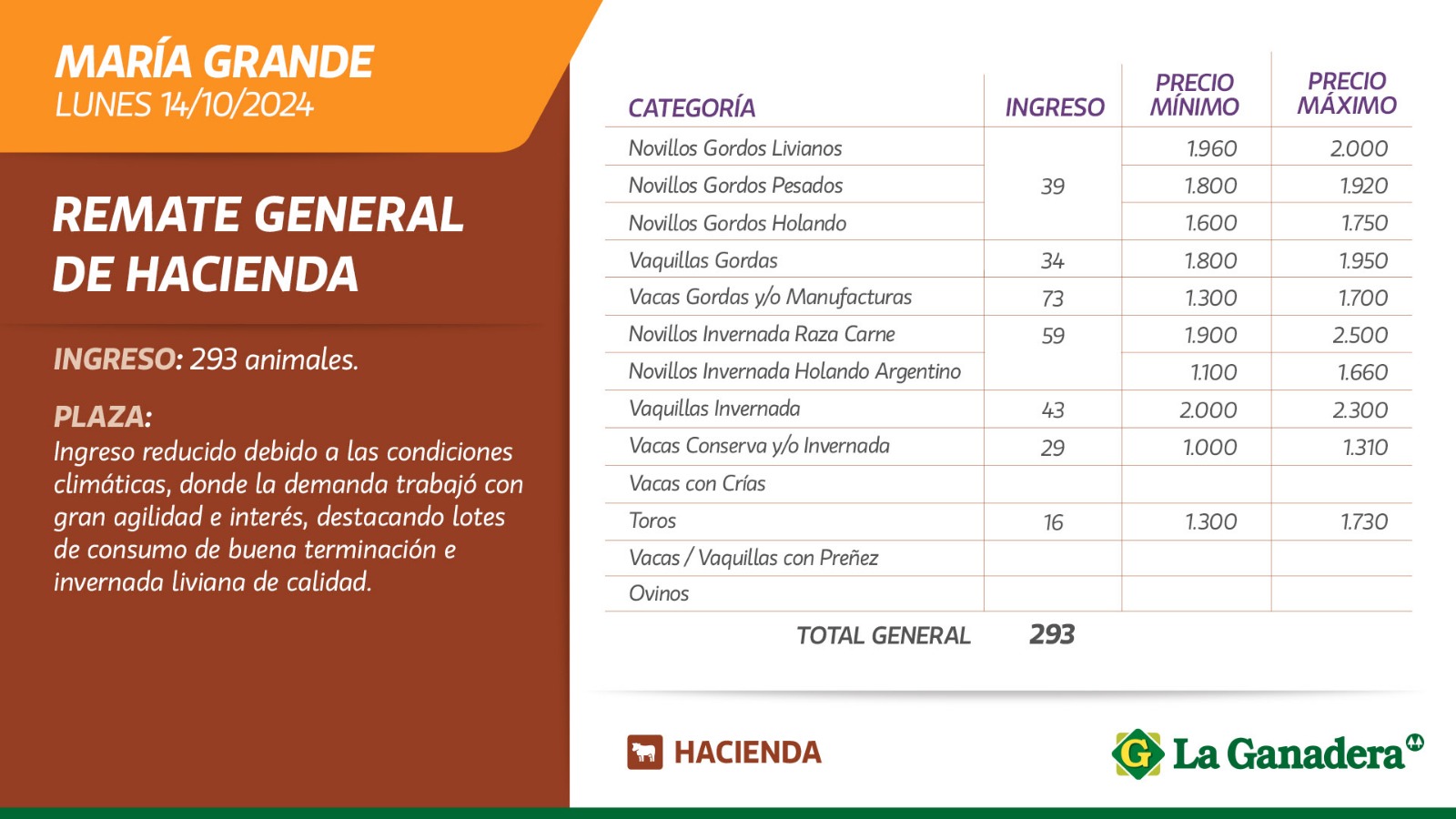 Desde Cooperativa La Ganadera de General Ramírez dieron a conocer los valores mínimos y máximos que se obtuvieron en el remate general de hacienda que realizaron este lunes 14 de octubre en María Grande. En total ingresaron 293 animales.