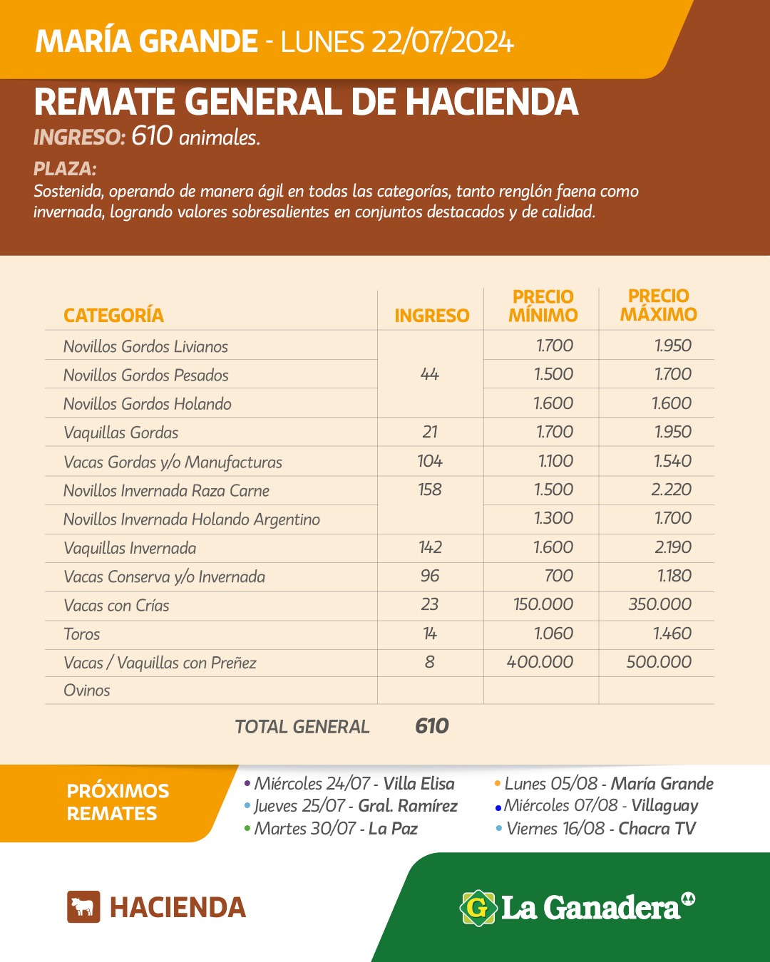 Desde Cooperativa La Ganadera de General Ramírez dieron a conocer los valores mínimos y máximos que se obtuvieron en el remate general de hacienda que realizaron este lunes 22 de julio en María Grande. En total ingresaron 610 animales.