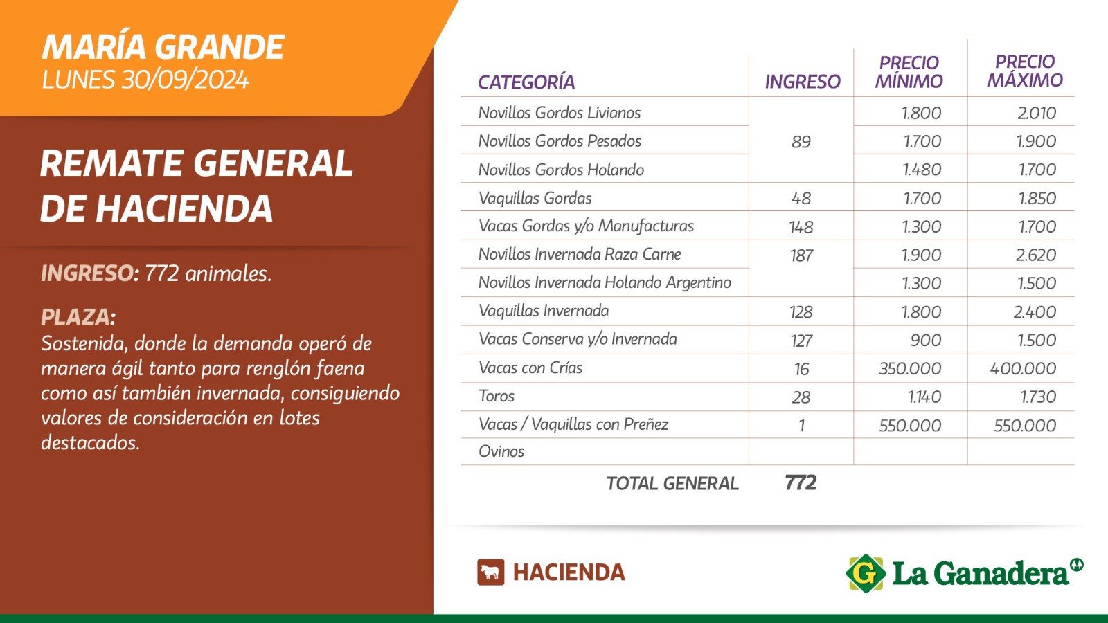 Desde Cooperativa La Ganadera de General Ramírez dieron a conocer los valores mínimos y máximos que se obtuvieron en el remate general de hacienda que realizaron este lunes 30 de septiembre en María Grande. En total ingresaron 772 animales.