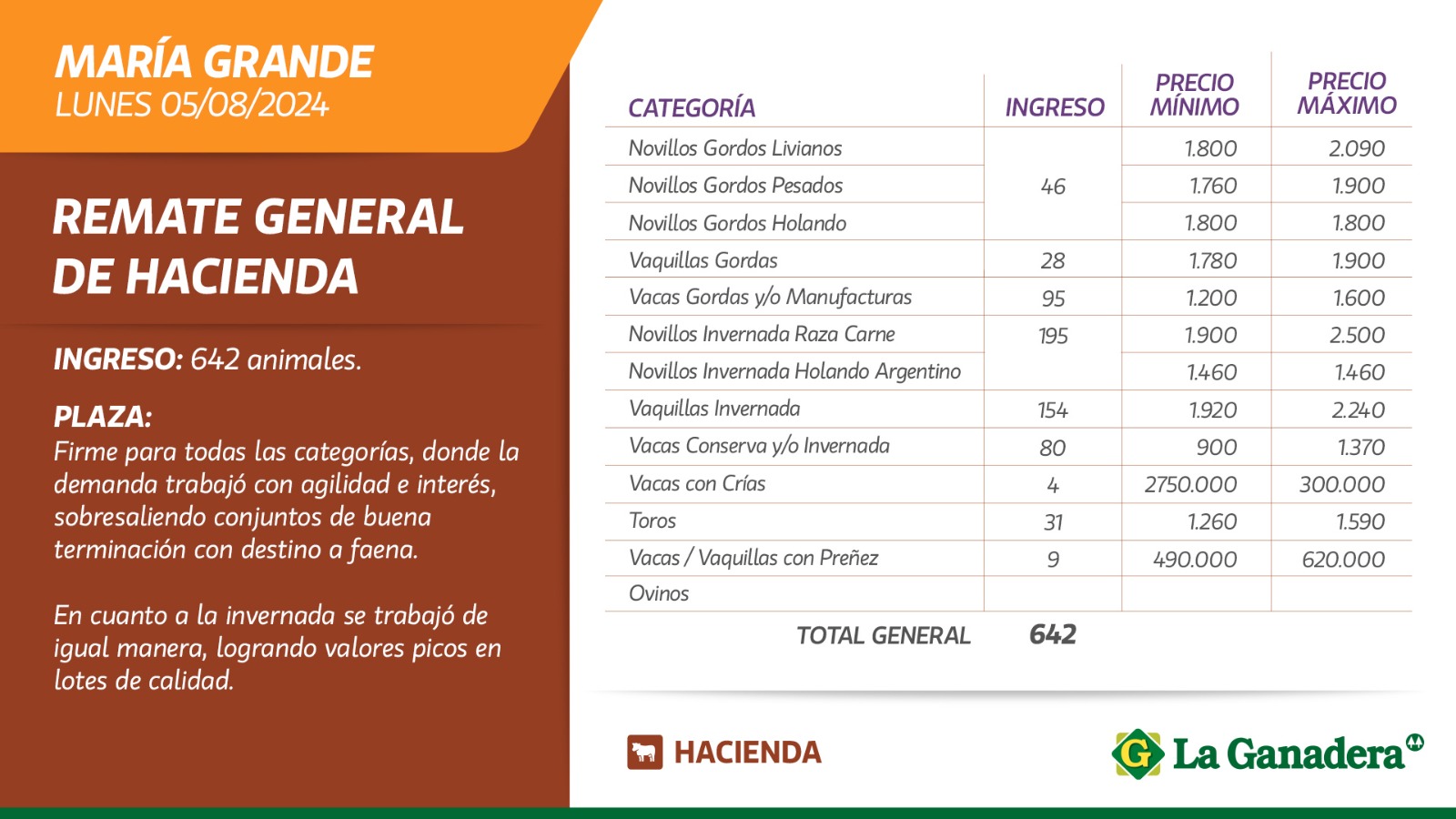 Desde Cooperativa La Ganadera de General Ramírez dieron a conocer los valores mínimos y máximos que se obtuvieron en el remate general de hacienda que realizaron este lunes 5 de agosto en María Grande. En total ingresaron 642 animales.