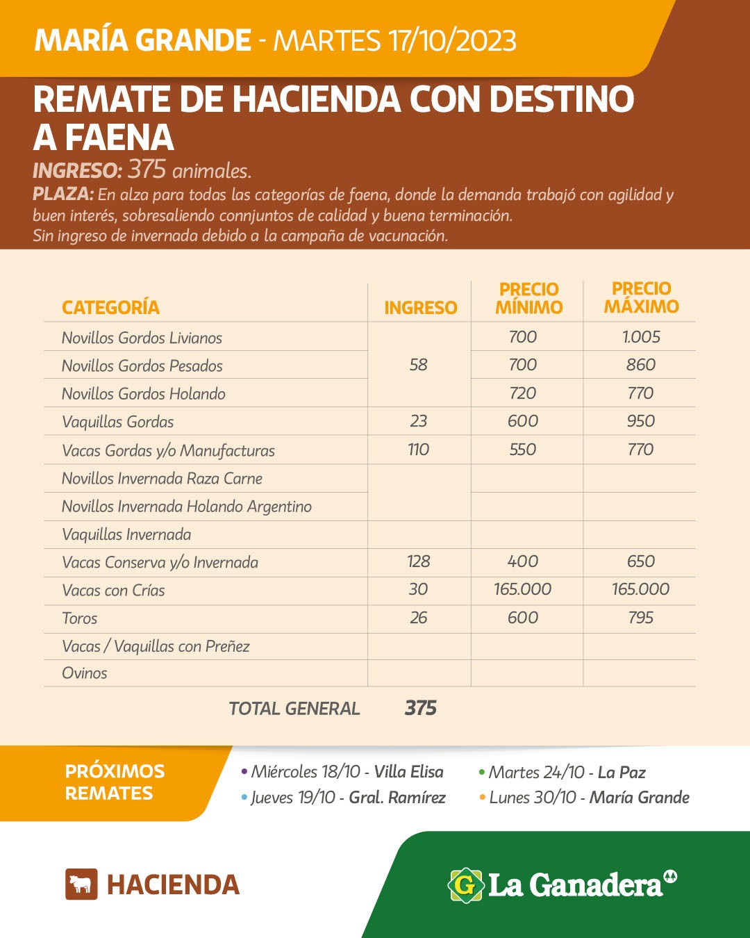 Desde Cooperativa La Ganadera de General Ramírez dieron a conocer los valores mínimos y máximos que se obtuvieron en el remate general de hacienda que realizaron este martes 17 de octubre en María Grande. En total ingresaron 375 animales.