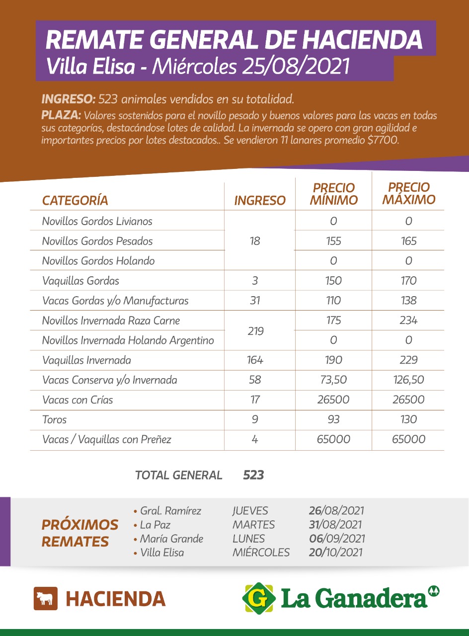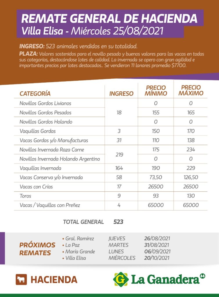 Desde Cooperativa La Ganadera de General Ramírez dieron a conocer los valores mínimos y máximos que se obtuvieron en el remate general de hacienda del miércoles 26 de agosto en el predio de Villa Elisa. En total ingresaron 523 animales que fueron vendidos en su totalidad.