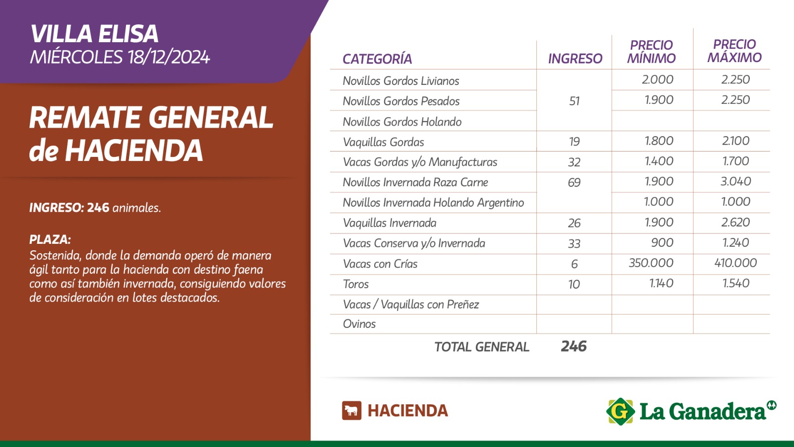 Desde Cooperativa La Ganadera de General Ramírez dieron a conocer los valores mínimos y máximos que se obtuvieron en el remate general de hacienda del miércoles 18 de diciembre en Villa Elisa. En total ingresaron 246 animales.
