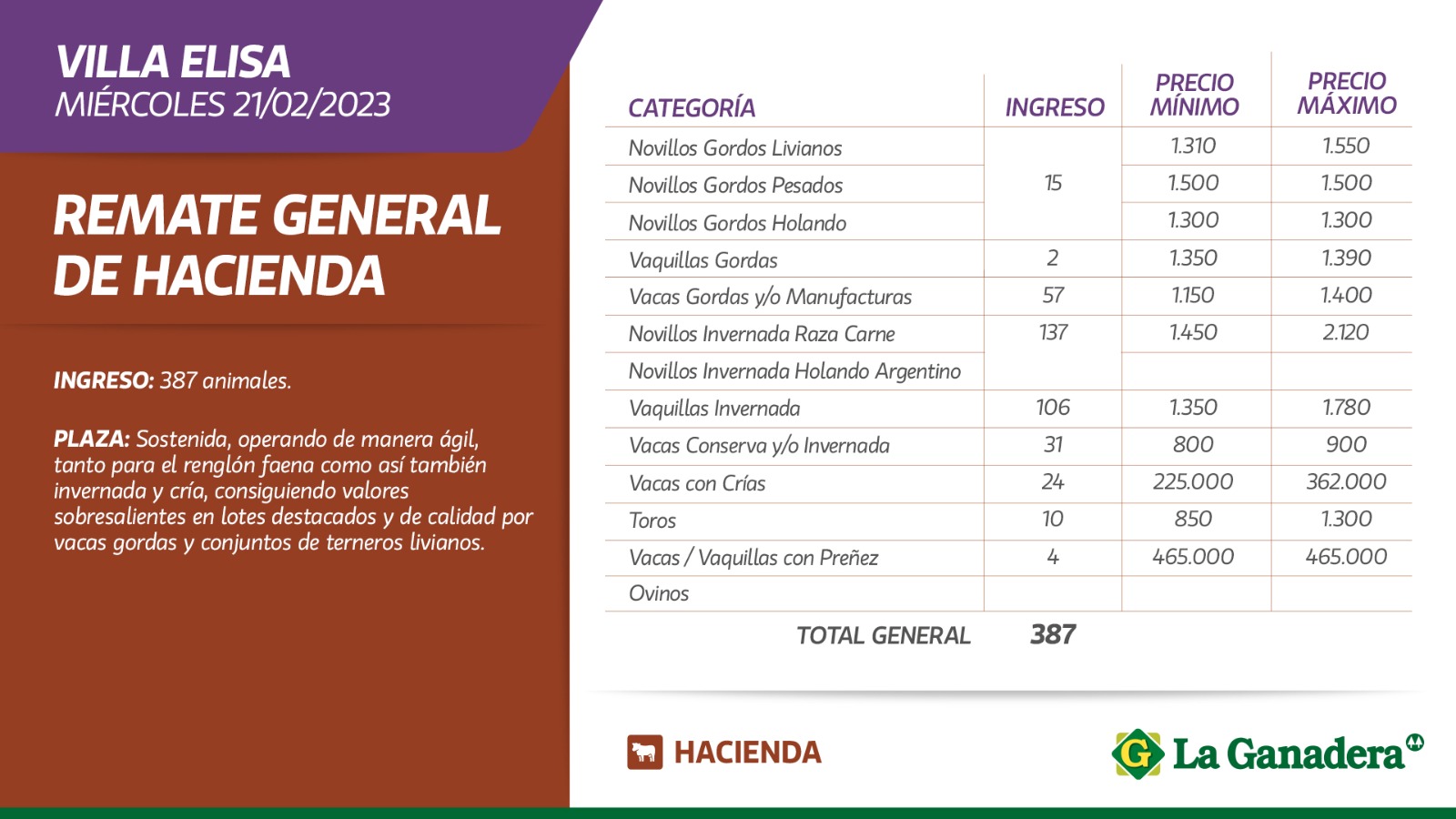 Desde Cooperativa La Ganadera de General Ramírez dieron a conocer los valores mínimos y máximos que se obtuvieron en el remate general de hacienda del miércoles 21 de febrero en Villa Elisa. En total ingresaron 387 animales.