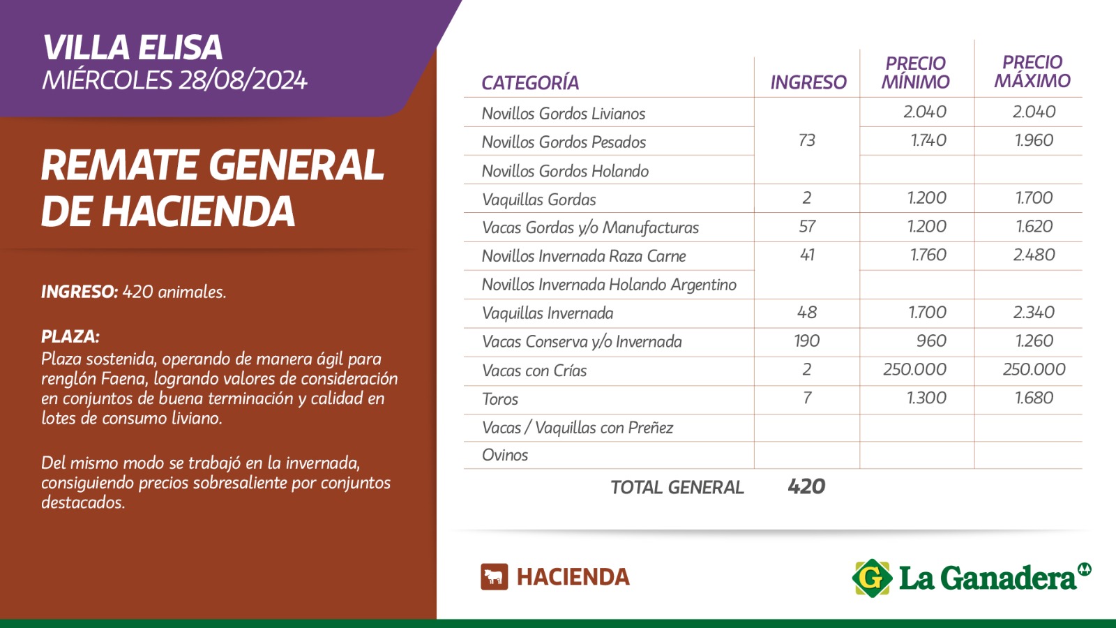 Desde Cooperativa La Ganadera de General Ramírez dieron a conocer los valores mínimos y máximos que se obtuvieron en el remate general de hacienda del miércoles 28 de agosto de 2024 en el predio ferial de Villa Elisa. En total ingresaron 420 animales.