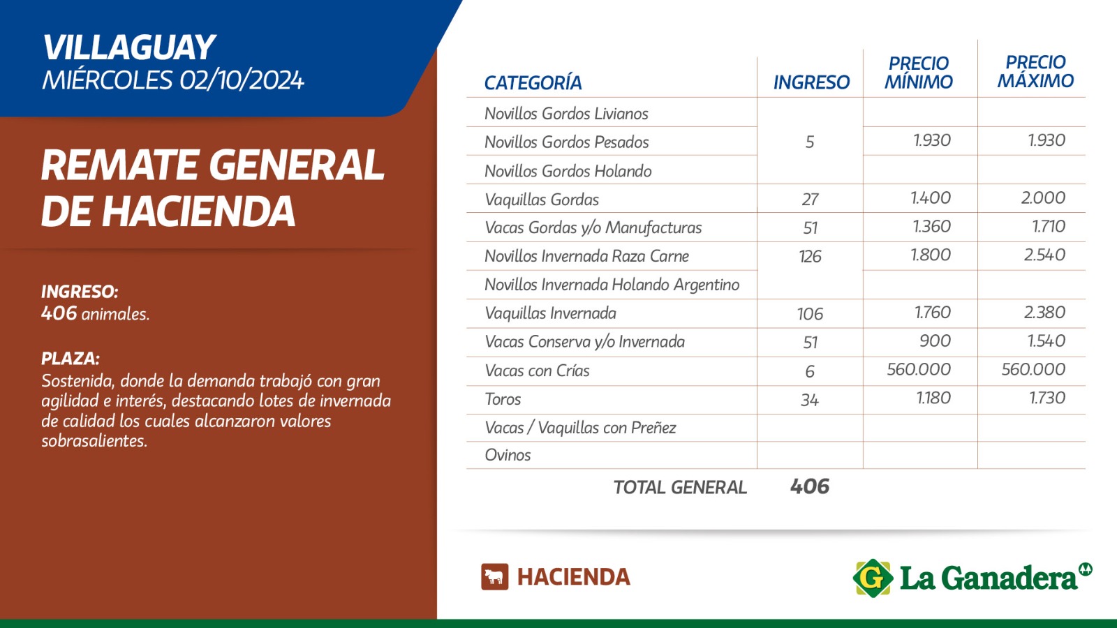 Desde Cooperativa La Ganadera de General Ramírez dieron a conocer los valores mínimos y máximos que se obtuvieron en el remate general de hacienda del miércoles 2 de octubre de 2024 en el predio ferial de Villaguay. En total ingresaron 406 animales.