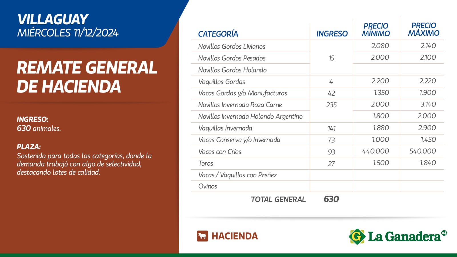 Desde Cooperativa La Ganadera de General Ramírez dieron a conocer los valores mínimos y máximos que se obtuvieron en el remate general de hacienda del miércoles 11 de diciembre de 2024 en el predio ferial de Villaguay. En total ingresaron 630 animales.