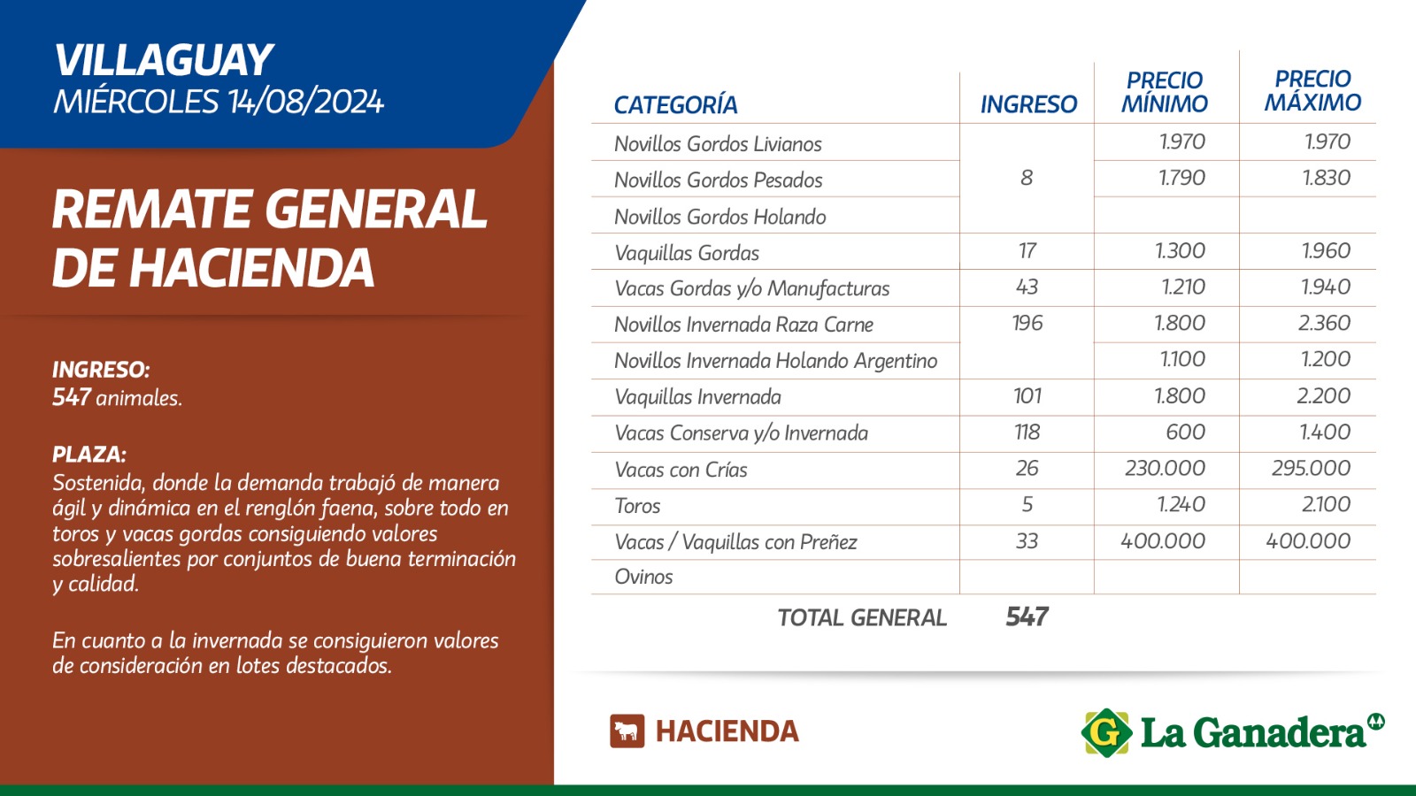 Desde Cooperativa La Ganadera de General Ramírez dieron a conocer los valores mínimos y máximos que se obtuvieron en el remate general de hacienda del miércoles 14 de agosto de 2024 en el predio ferial de Villaguay. En total ingresaron 547 animales.