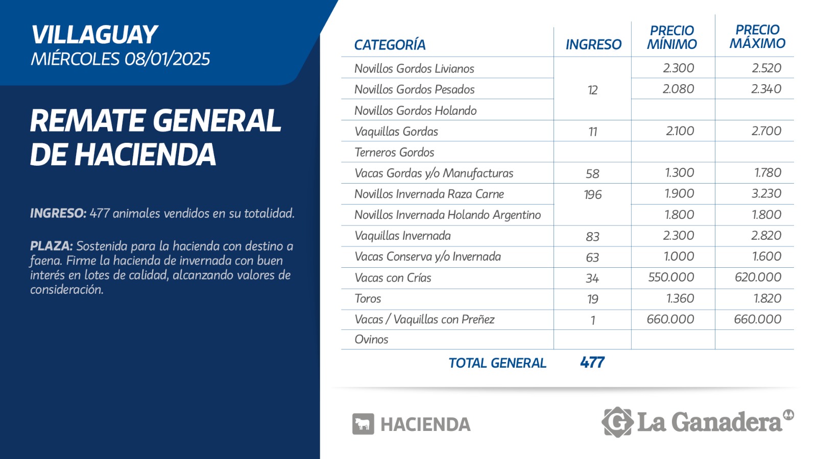 Desde Cooperativa La Ganadera de General Ramírez dieron a conocer los valores mínimos y máximos que se obtuvieron en el remate general de hacienda del miércoles 8 de enero de 2025 en el predio ferial de Villaguay. En total ingresaron 477 animales.