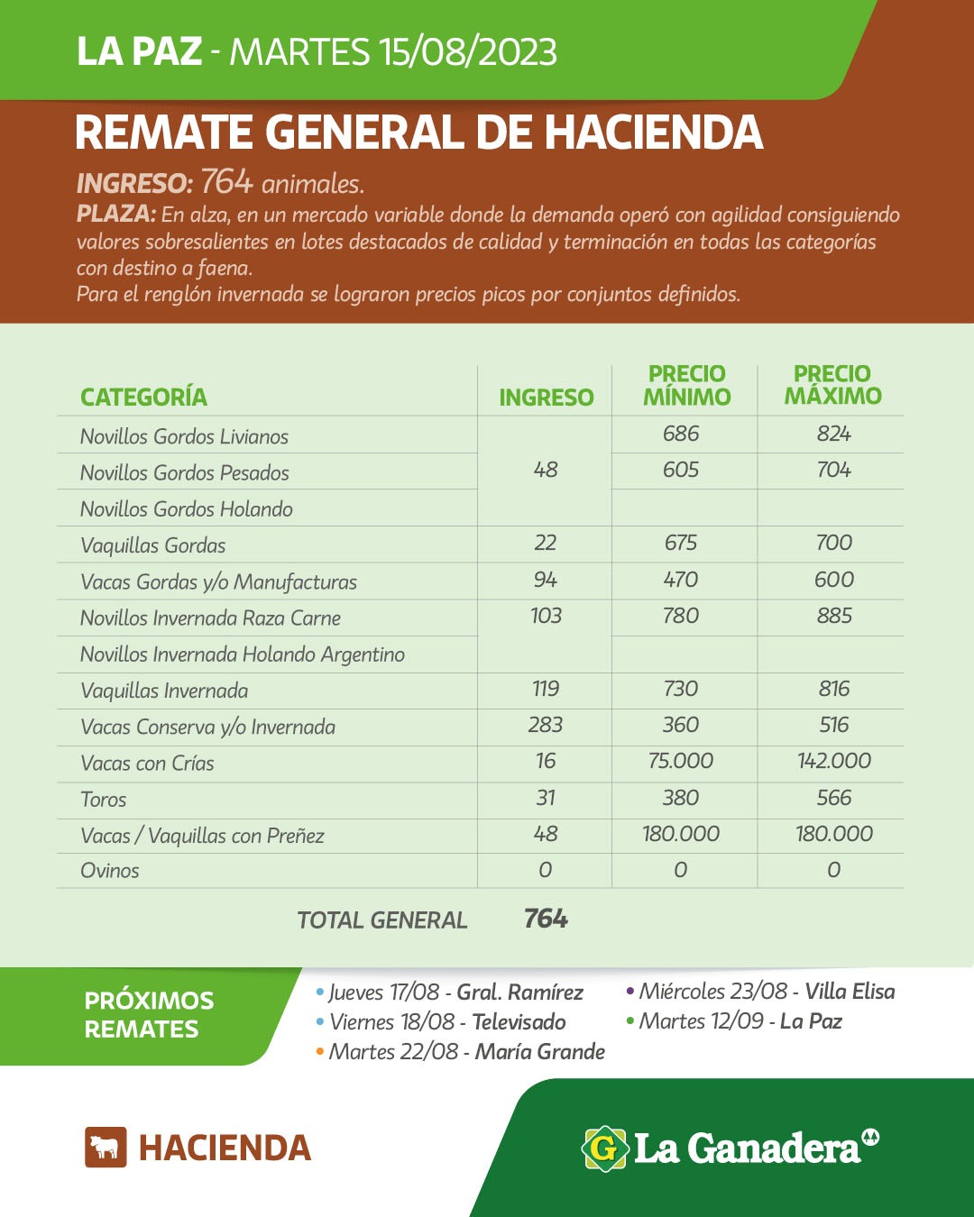 Desde Cooperativa La Ganadera de General Ramírez dieron a conocer los valores mínimos y máximos que se obtuvieron en el remate general de hacienda del martes 15 de agosto en el predio ferial de La Paz. En total ingresaron 764 animales.
