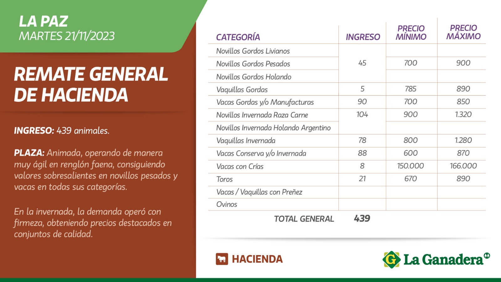 Desde Cooperativa La Ganadera de General Ramírez dieron a conocer los valores mínimos y máximos que se obtuvieron en el remate general de hacienda del martes 21 de noviembre en el predio ferial de La Paz. En total ingresaron 439 animales.